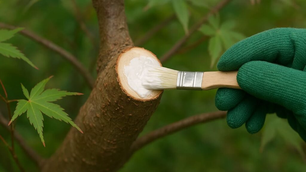 切り口が大きい場合は、癒合剤(トップジンMペーストなど)を塗っておくと安心です。雨水や病原菌の侵入を防ぎ、木を健康に保てます。