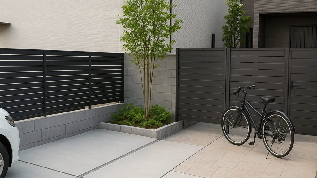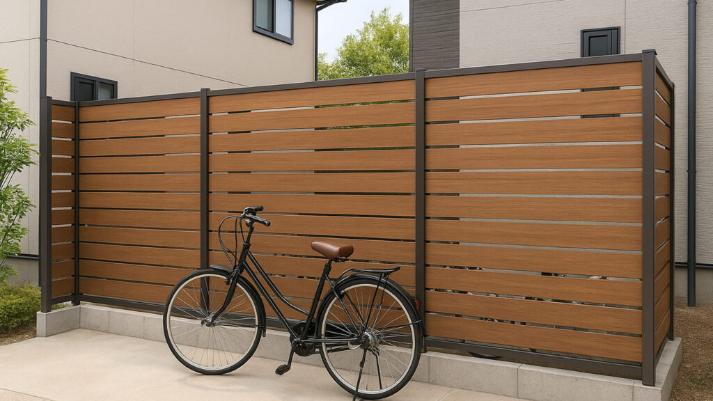 外構に目隠しフェンスを設けて駐輪場を囲えば、生活感を抑えながら防犯性も高まります。木目調アルミフェンスや樹脂フェンスなど、デザインの選択肢も豊富です。