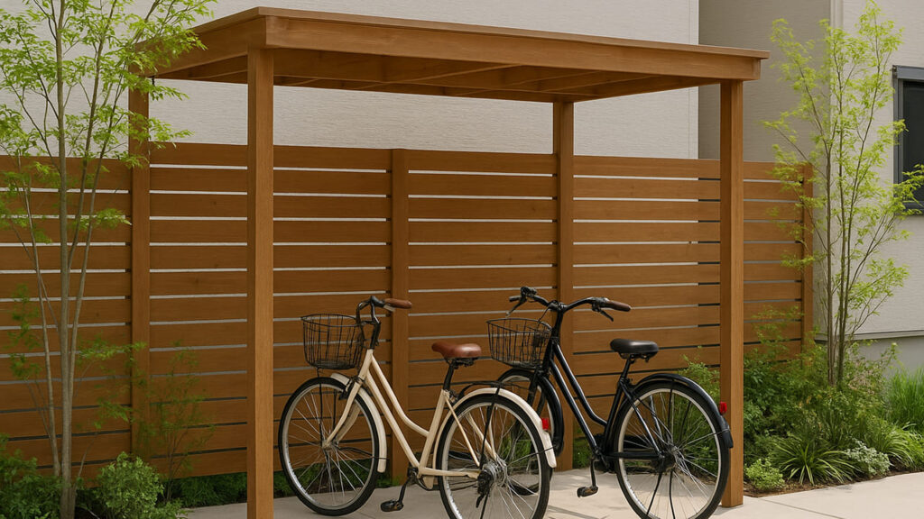 ウッド調フェンスや天然木の柱を使うと、外構全体にあたたかみが出ます。植栽と組み合わせれば、ガーデンと一体化したナチュラルな駐輪スペースが完成します。