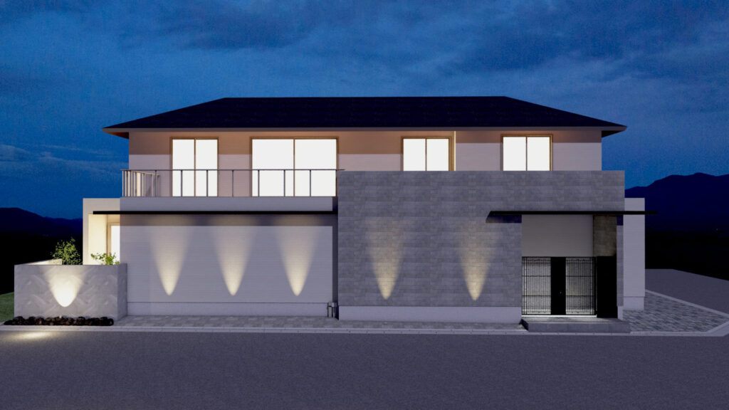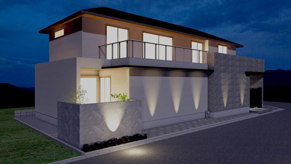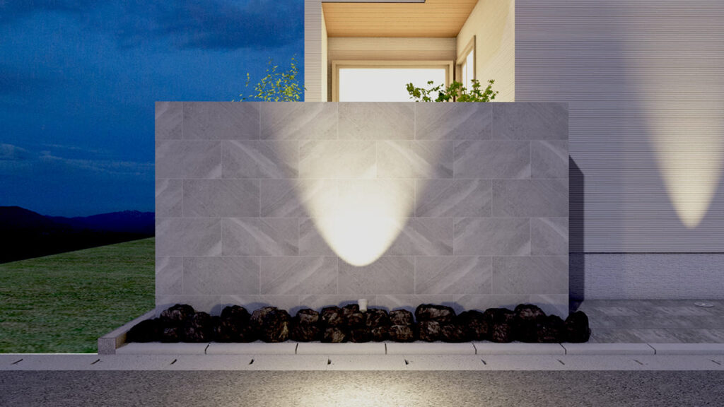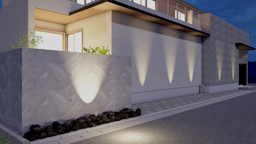 施主様の照明でおしゃれにしたいという眺望に応えて、壁面をライトアップするプランでご提案、アプローチ側は下から扇形へ広がります。坪庭はポールライトで庭全体を明るく出来るように致しました。またタイマーも設置しておりますので時間になったら自動でライトが付く世にしました。