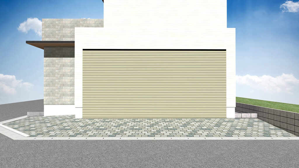 ブルー系の石英岩を正方形にカットした東洋工業のオークルストーンブルーノを使った駐車場です。最初はガレージ前はハウスメーカー様でコンクリートのみで施工される予定で、コーナー部分でのご邸案でしたが、こちらの石を気に入ってくださり全面でのご提案となりました。高級感のある駐車場になっております。
