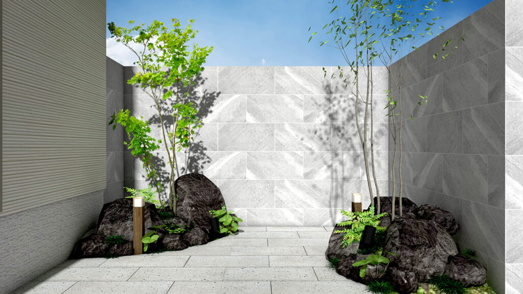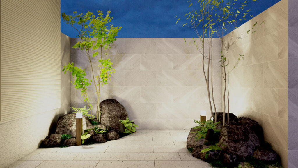 坪庭は2つで1つは既存の和風のお庭があり、これとは別のコンセプトのお庭にしたいという事とメンテナンスが少ないお庭にしたいという2点の要望がありました。植栽は成長の遅い木をチョイスして量は少なめ、石をメインをしたお庭に致しました。全体的にグレーなので黒い石を使い、締まるようにデザインしました。おしゃれなタイルの塀で完全に囲っておりプライベート空間を確保致しました。夜は植栽をライトアップ致します。全体的に暖色の色のライトを使用して暖かみを出しています。