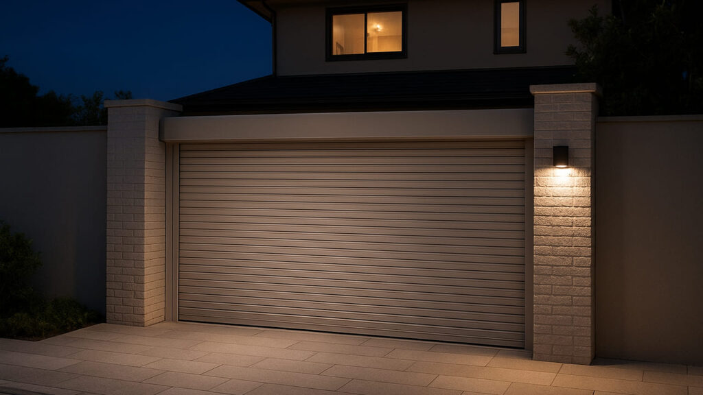 シャッター型の電動ゲートで敷地をしっかり囲い、防犯性とプライバシーを両立。夜間も自動照明と連動し、安心して出入り可能。