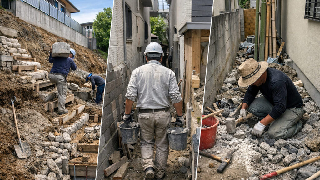 高低差のある土地、狭小地、重機が入らない現場などは、施工手間が増え、費用も高くなります。