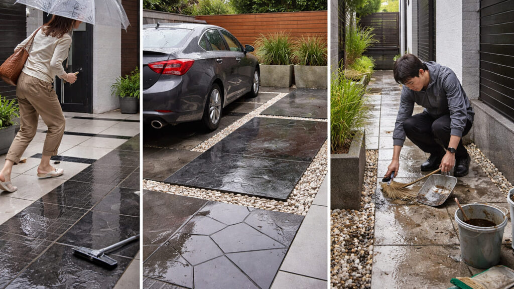見た目だけで決めた結果、雨の日に滑る、駐車しにくい、掃除が大変などの不満が出ます。