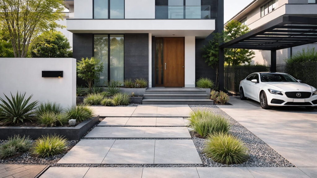 - 駐車場やアプローチが道路と一体化した印象