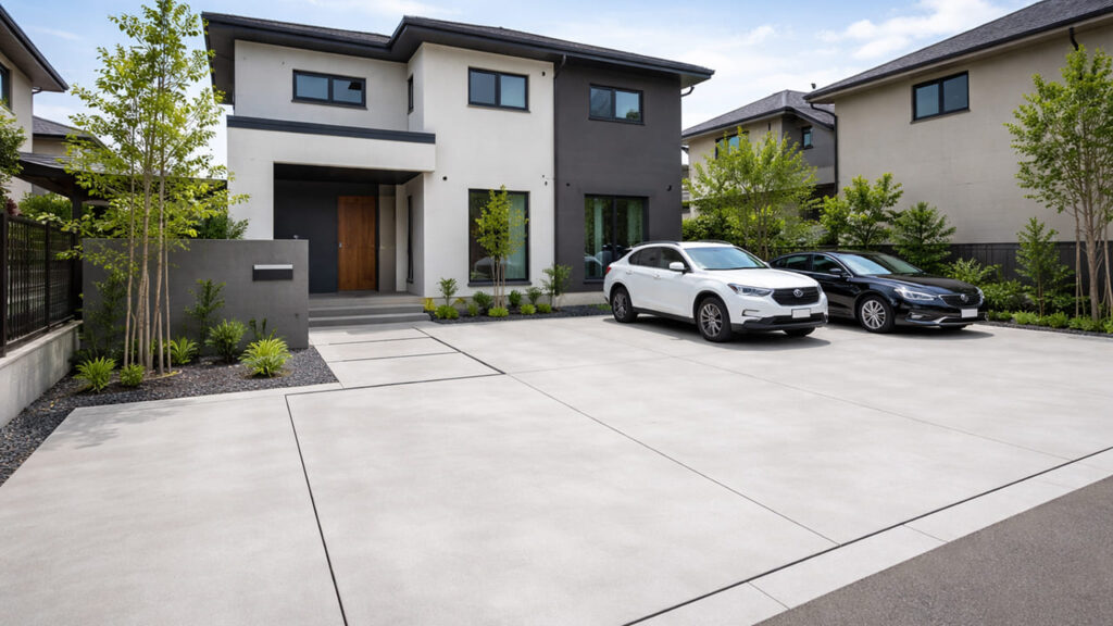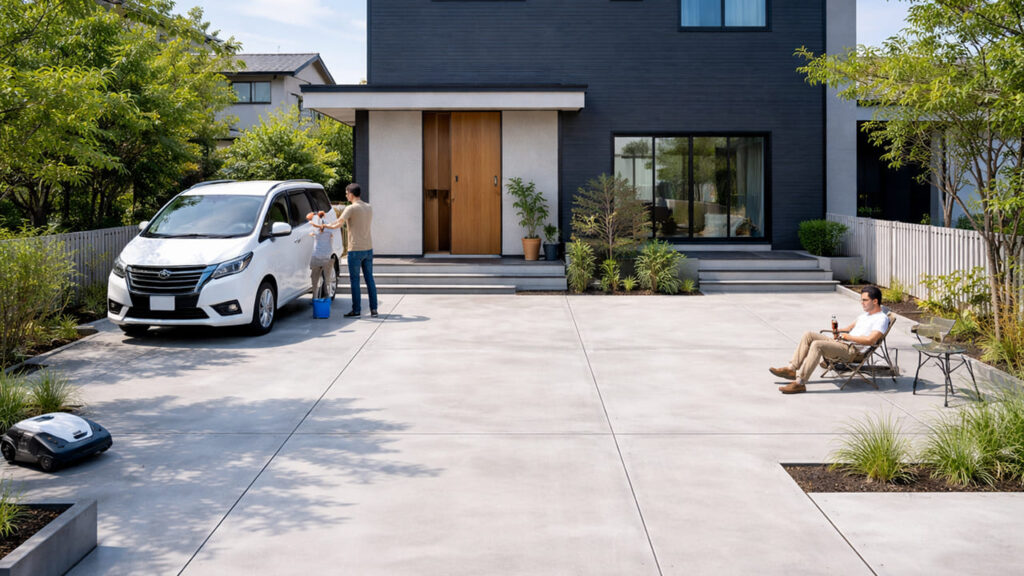 外構の全面コンクリートは、駐車場と庭の境界がないため、敷地全体を広く使える点もメリットです。来客時に一時的に車を多く停めたい場合や、将来台数が増える可能性がある場合にも柔軟に対応できます。また、タイヤの沈み込みや轍(わだち)ができないため、長期的に見ても使いやすい状態を保ちやすいです。