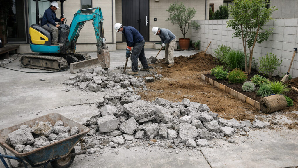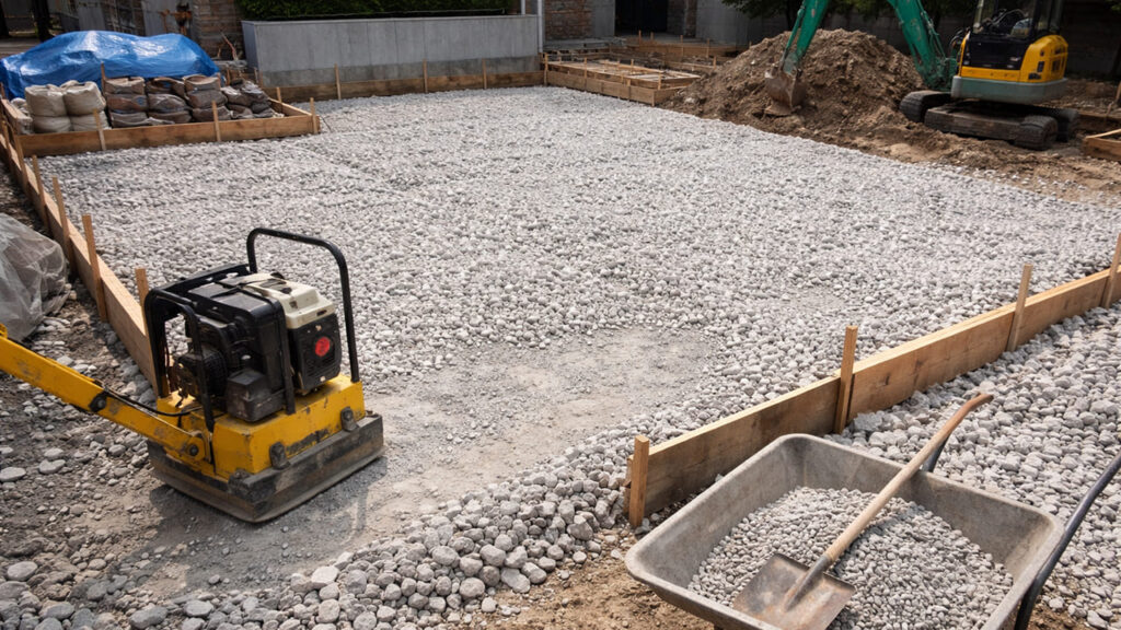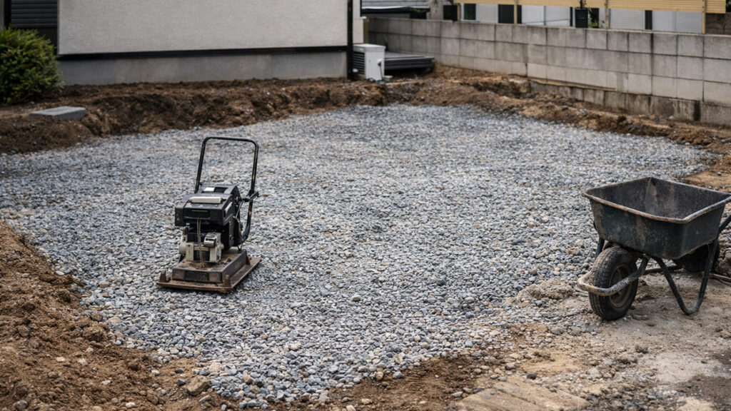 地面を掘削し、砕石を敷いて転圧します。この下地が弱いと、将来的に沈下やひび割れが起こりやすくなります。
