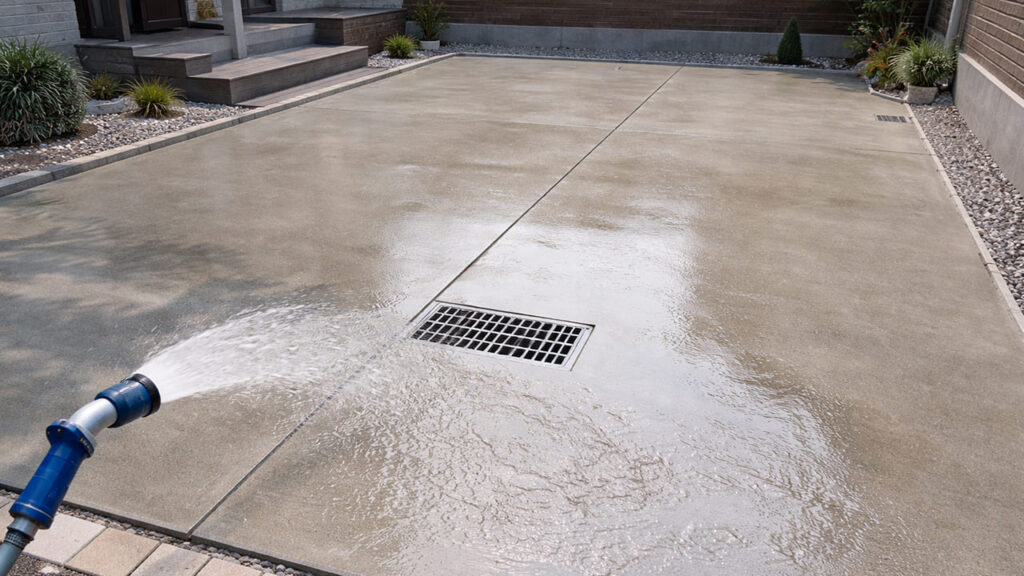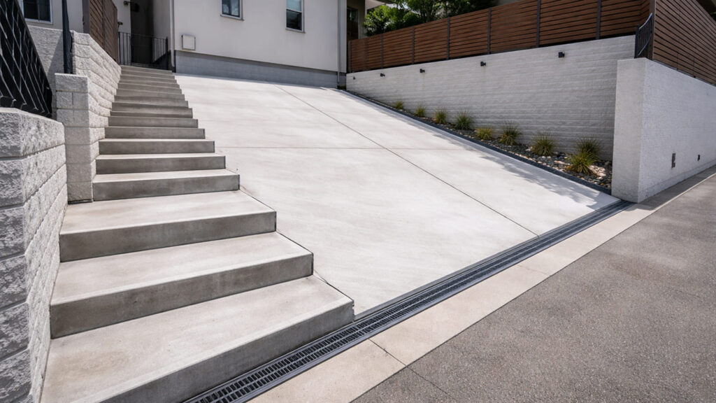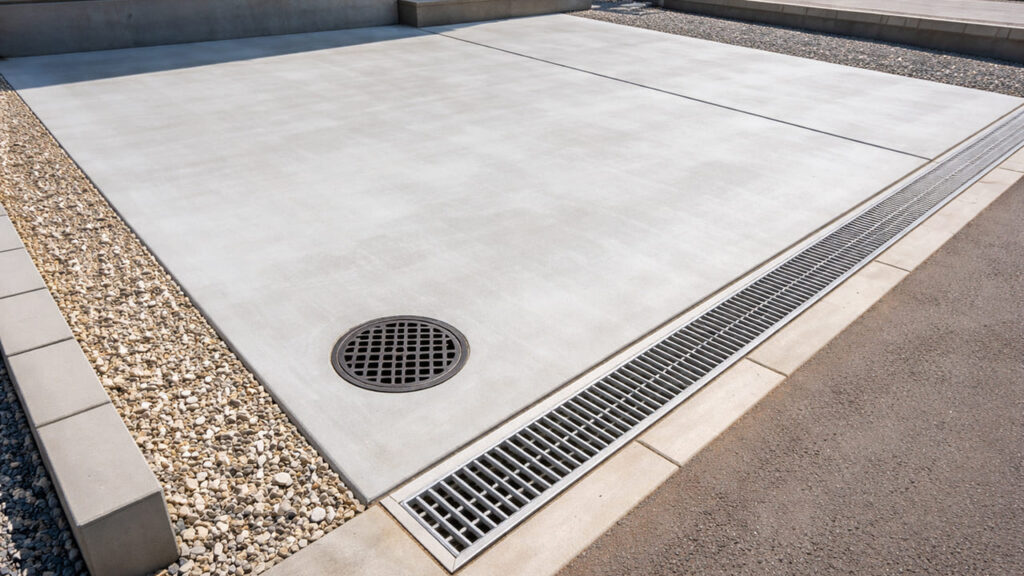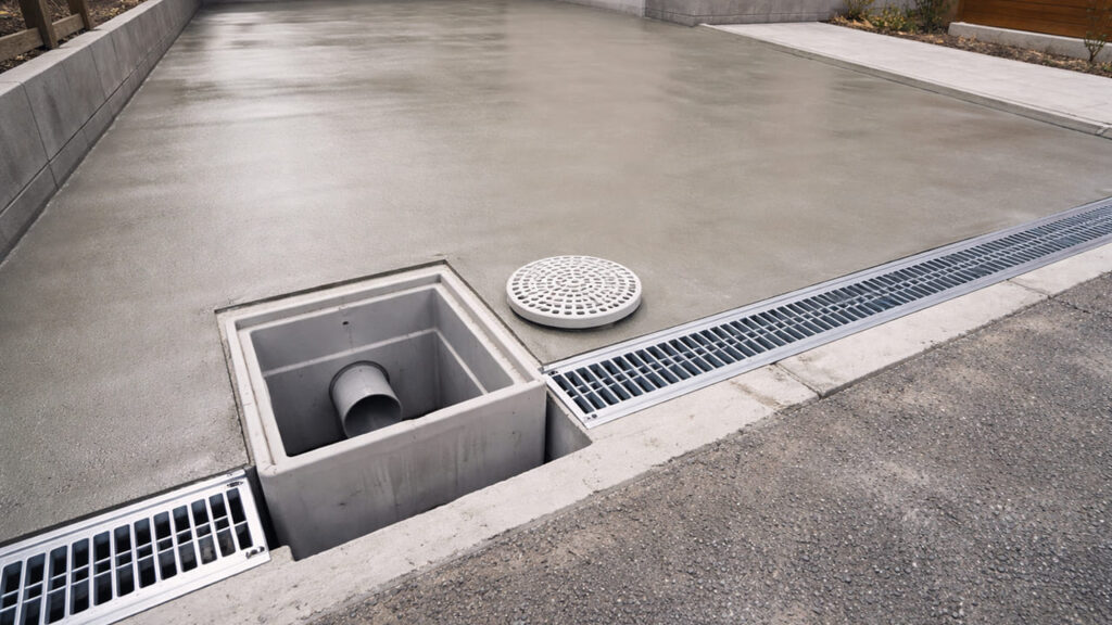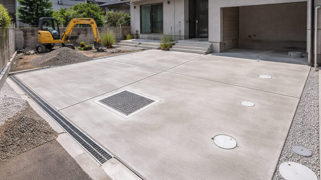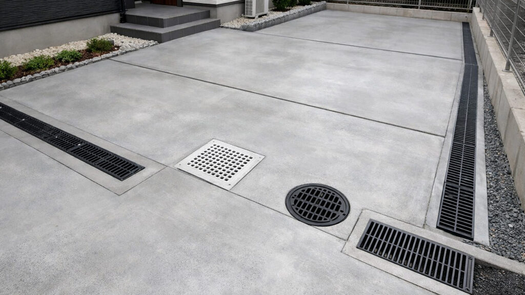 外構 全面コンクリートは水が地面に浸透しないため、排水計画が非常に重要です。勾配をつけたり、排水桝や側溝を設置したりすることで、水たまりや浸水を防ぎますが、その分費用は上がります。