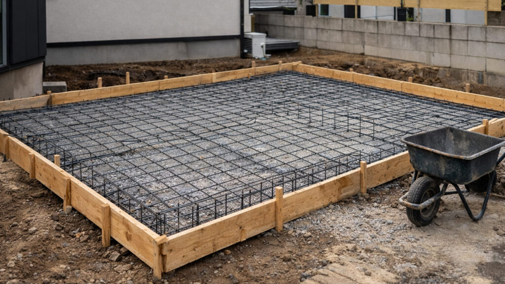 コンクリートを流す範囲に型枠を設置し、必要に応じて鉄筋やワイヤーメッシュを入れます。車が乗る部分では特に配筋が重要になります。
