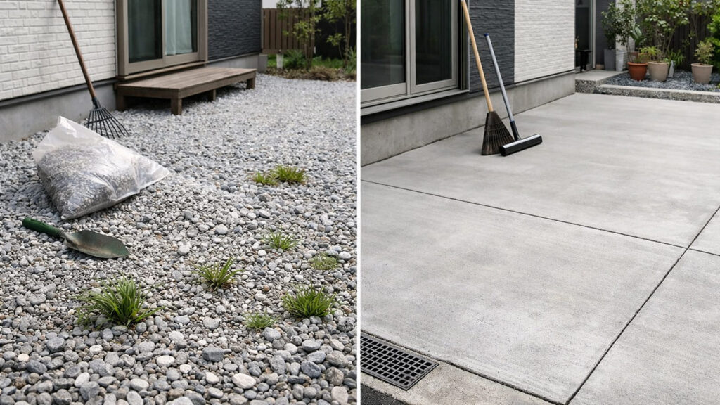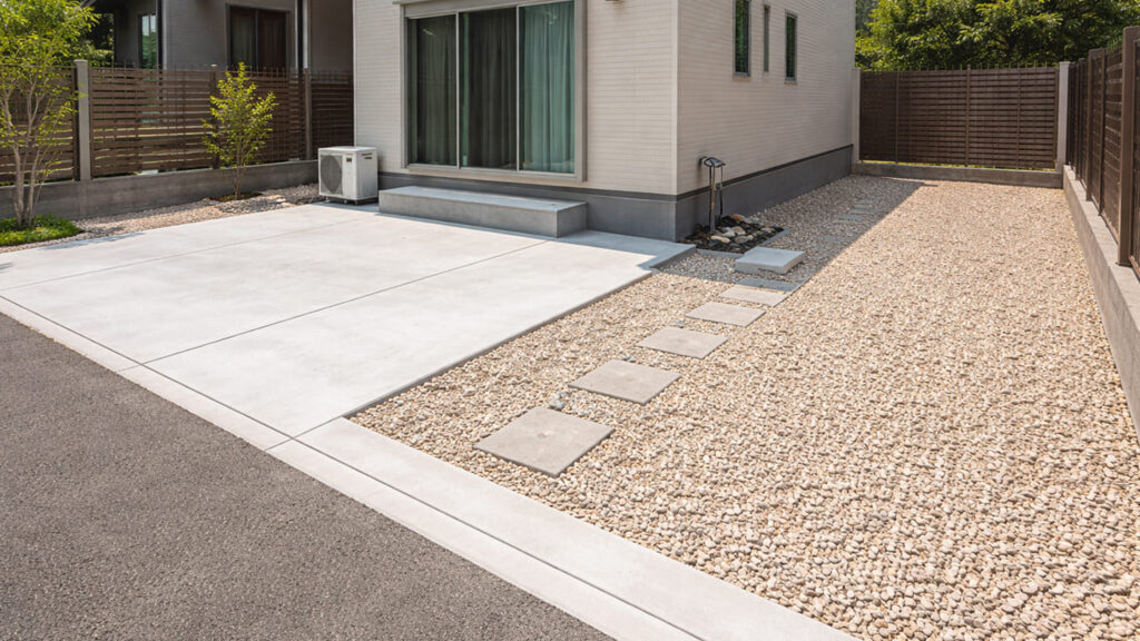 砂利はコストが安く、水はけが良い点がメリットですが、歩きにくく、雑草が生えやすく、定期的な補充が必要になります。外構 全面コンクリートは初期費用は高めですが、長期的には管理が圧倒的に楽になります。