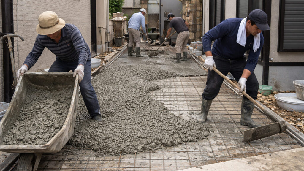 生コンクリートを流し込み、金ゴテや刷毛引きで仕上げます。滑り止めが必要な場所では刷毛引き仕上げが選ばれることが多いです。