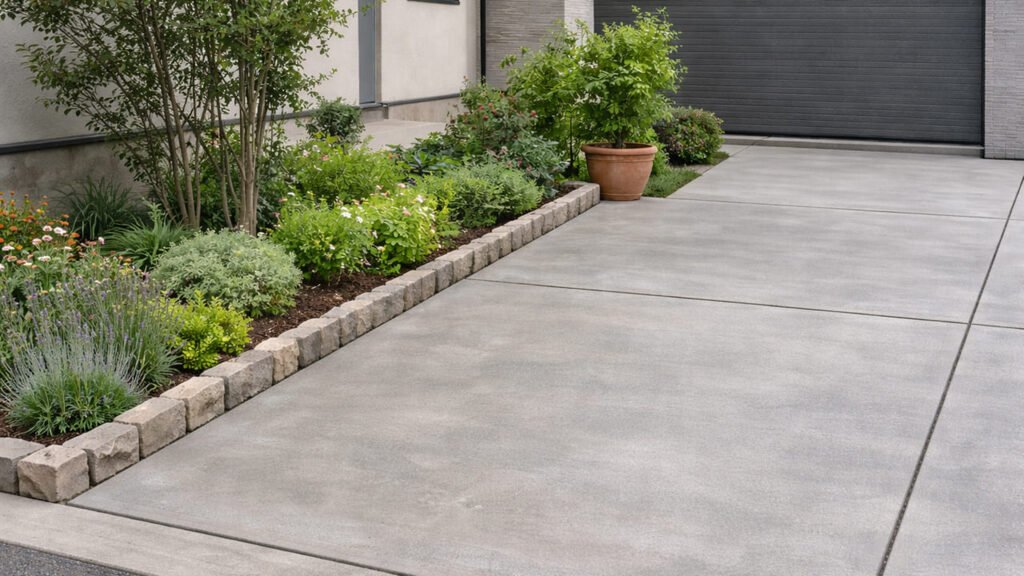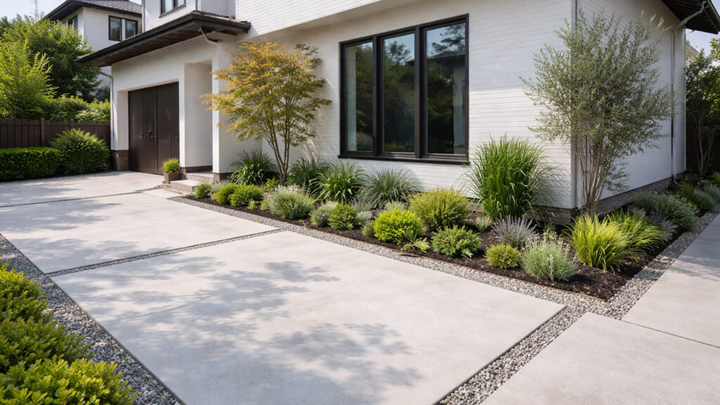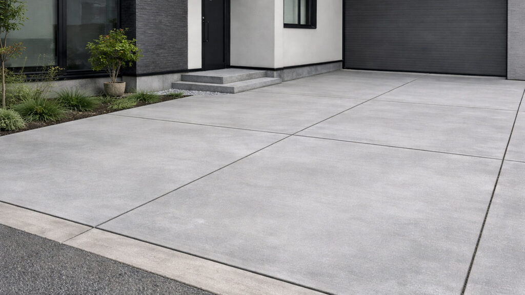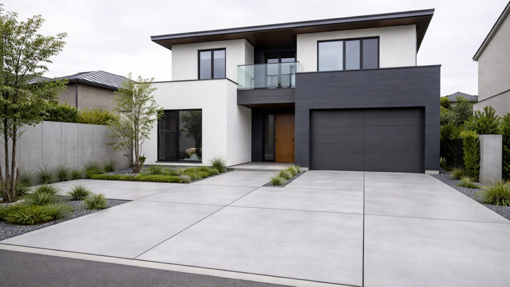外構の全面コンクリートはシンプルなデザインになるため、建物の外観を邪魔せず、すっきりとした印象になります。特にモダン住宅やシンプルな外観の建物とは相性が良く、「余計な装飾を入れずに整えたい」という方に向いています。