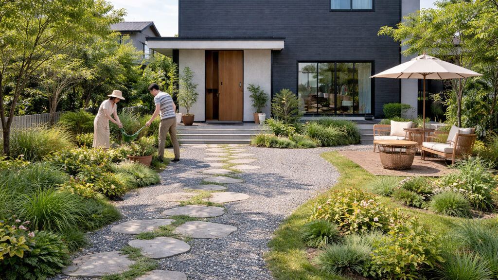 外構の全面コンクリートは実用性が高い反面、どうしても無機質で冷たい印象になりがちです。「緑のある庭にしたい」「季節感を楽しみたい」という方には、少し物足りなく感じる場合があります。