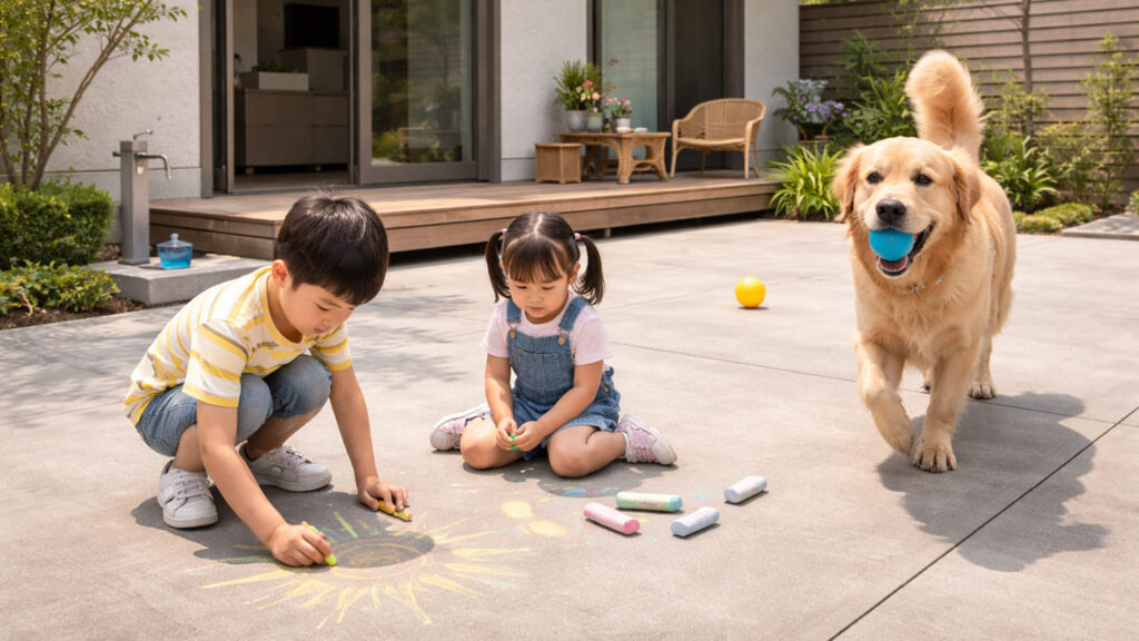 外構 全面コンクリートは、夏になると地面の温度が非常に高くなります。裸足で歩けないほど熱くなることもあり、庭で子どもを遊ばせたい場合や、ペットがいる家庭では大きな問題になることがあります。対策としては、一部に植栽帯を設けたり、ウッドデッキやタイルテラスを組み合わせたり、日陰をつくる工夫をすることが重要です。