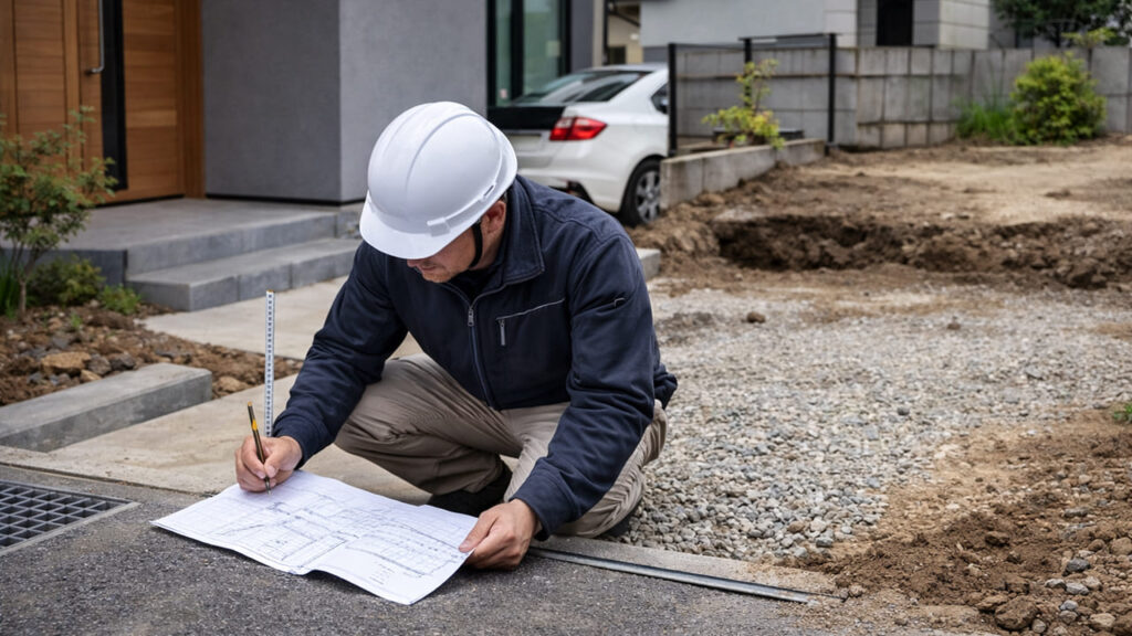 まず敷地の広さ・高低差・水の流れ・既存構造物の有無を確認し、外構 全面コンクリートの範囲と仕様を決めます。この段階で、排水方向・勾配・車の動線・将来の使い方まで想定することが重要です。