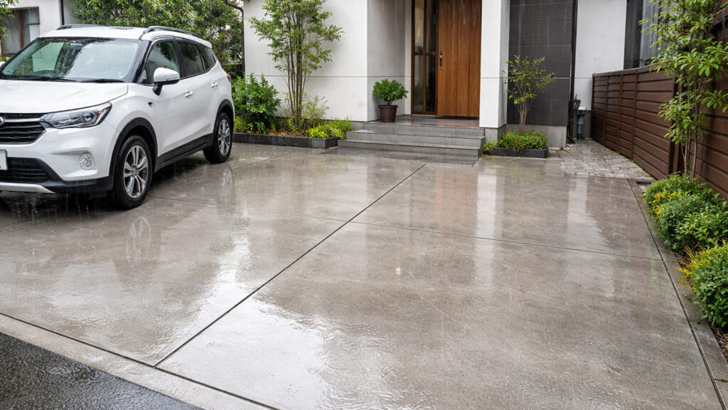 外構 全面コンクリートは水が浸透しないため、勾配設計が甘いと水たまりが発生します。これは見た目の問題だけでなく、滑りやすさや劣化の原因にもなります。外構 全面コンクリートを施工する際は、必ず排水方向・勾配・排水桝の位置まで確認することが大切です。