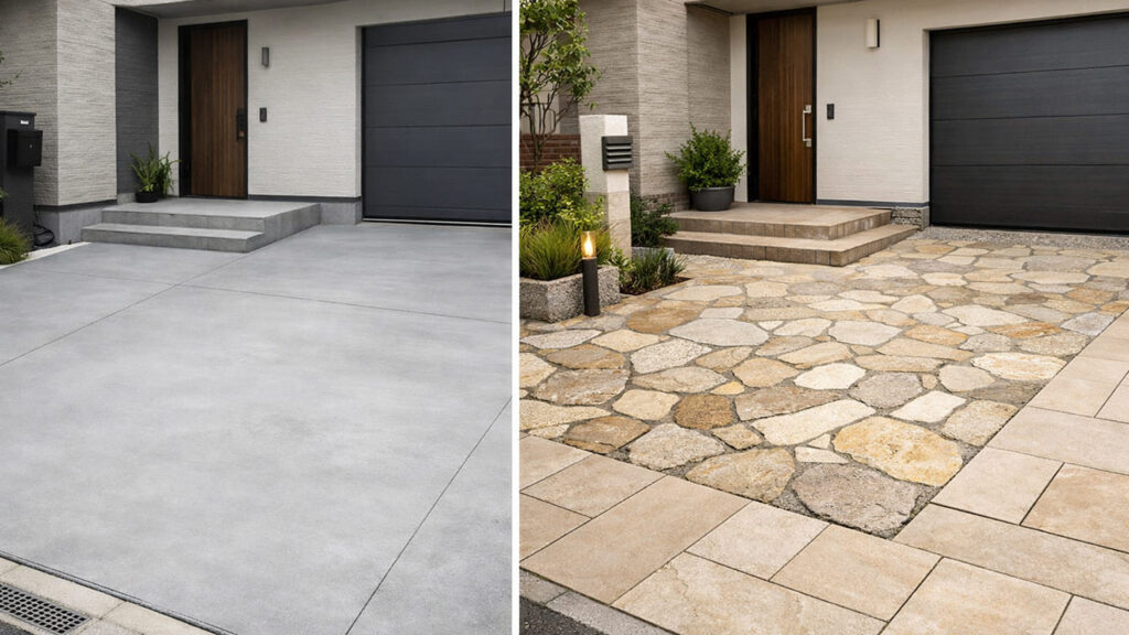 外構 全面コンクリートは実用性が高い一方で、他の素材と比較してはじめて見えてくる特徴もあります。ここでは代表的な外構素材と比べながら整理します。