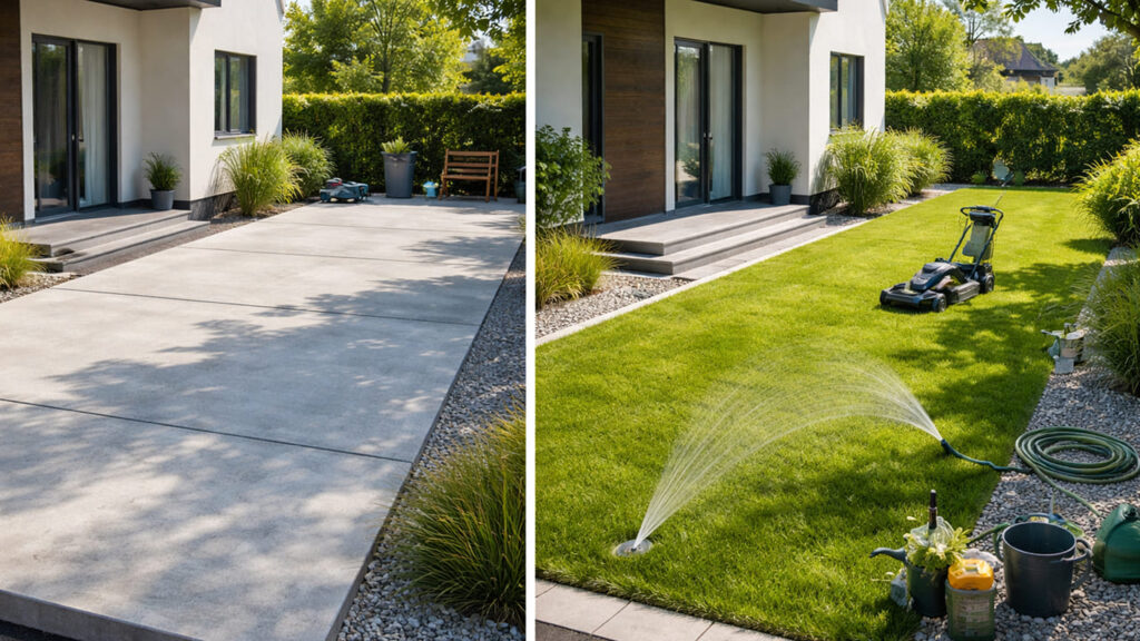 芝生は見た目が良く、夏の照り返しも抑えられますが、定期的な刈り込み・水やり・施肥が必要です。外構 全面コンクリートは景観性では劣るものの、管理負担は大きく軽減されます。