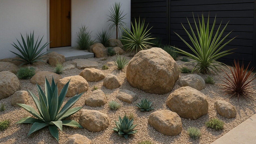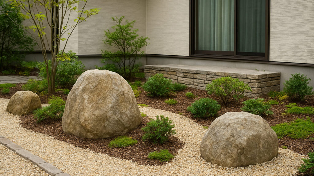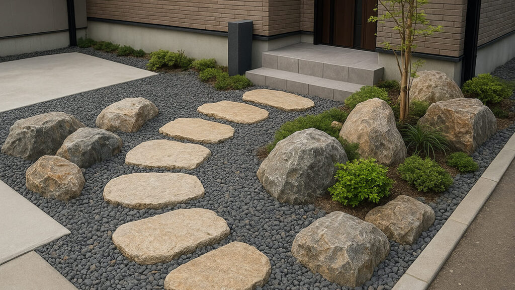 近年人気なのが、庭石を中心に構成するロックガーデン風の外構です。大小の石をランダムに配置し、ドライガーデン風の植栽(アガベ・ユッカ・コルジリネなど)を合わせると、海外リゾートのような雰囲気になります。