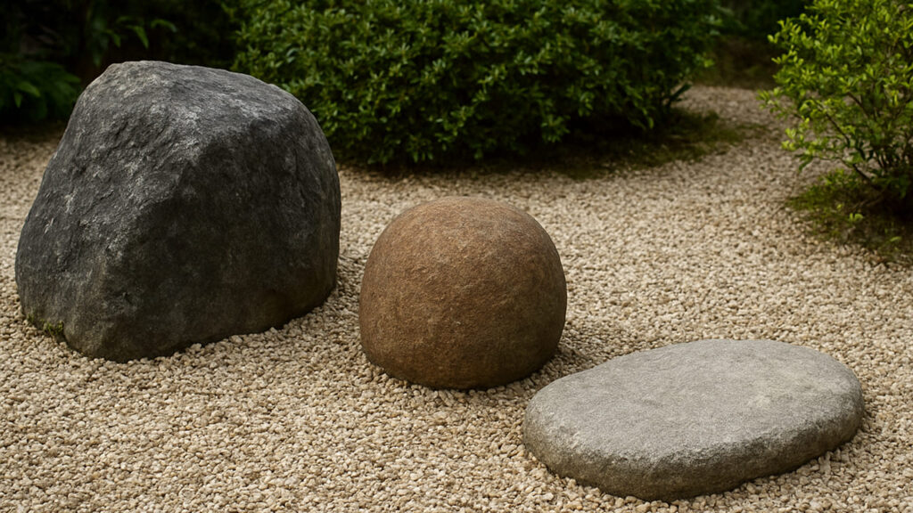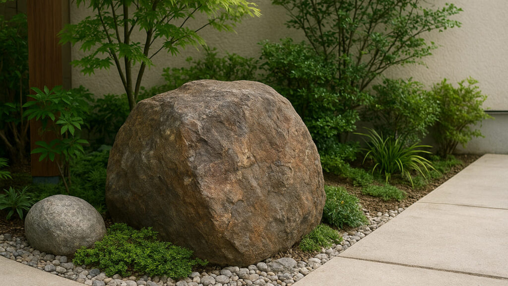 おしゃれな外構にするには、石の大きさと配置のバランスが重要です。大きな庭石を1つだけ置くと重厚感が出ますし、小石を複数並べるとナチュラルで軽やかな印象になります。3つの石を「三尊石組(さんそんいわぐみ)」のように配置するのも人気です。これは日本庭園でも使われる伝統的な技法で、中心に主石を置き、左右にやや低い石を配置して調和を取ります。