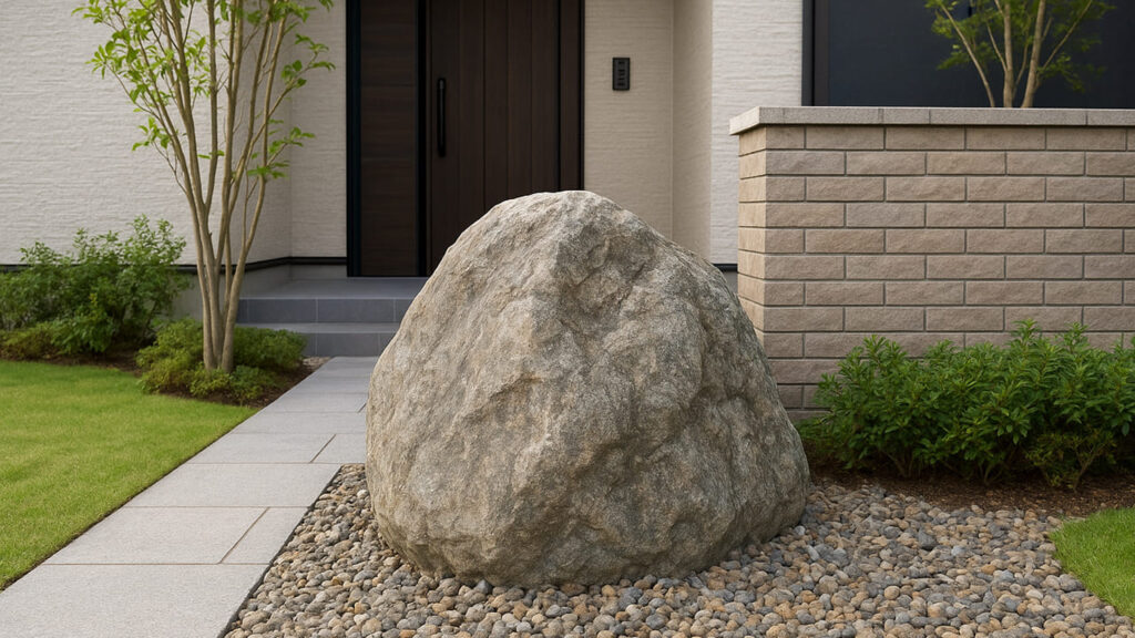 外構に庭石を配置することで、視線を引くポイント(フォーカルポイント)をつくれます。例えば門まわりやアプローチの脇に庭石を置くと、家全体の印象がグッと引き締まり、高級感のある仕上がりになります。