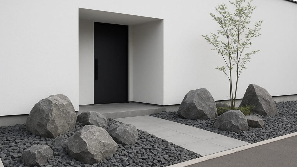 シンプルな住宅デザインに合わせて、割栗石や黒系の庭石を配置するとモダンな印象に。白い外壁にグレー系の石を合わせると、コントラストが美しく際立ちます。