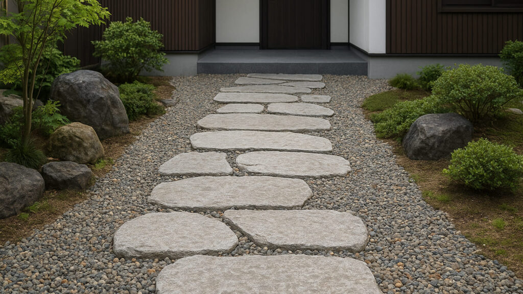 石を敷き詰めて通路のようにしたもの。外構と庭の境界をやわらかくつなぐ役割があり、和風モダン住宅にもよく合います。
