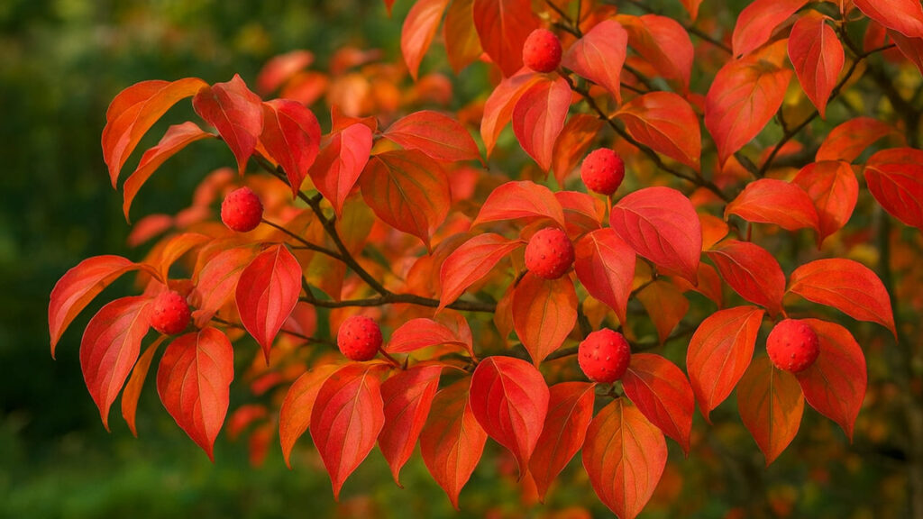 秋には赤やオレンジに色づき、可愛らしい赤い実をつけます。鳥も好む実で、自然な庭づくりにぴったりです。