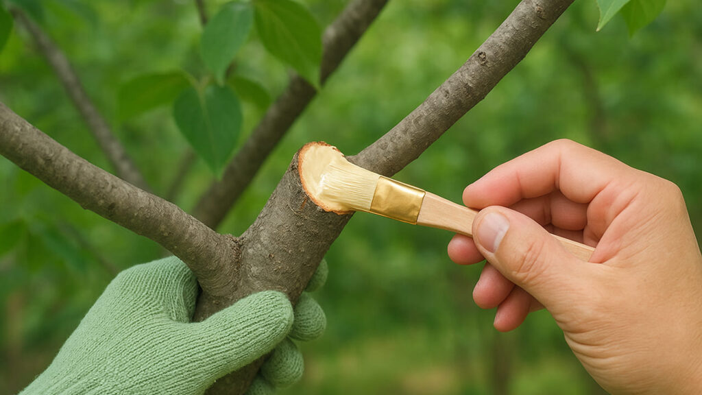 太い枝を切った後は、必ず「癒合剤(ゆごうざい)」を塗っておきます。雨水や病原菌の侵入を防ぎ、木を守ることができます。