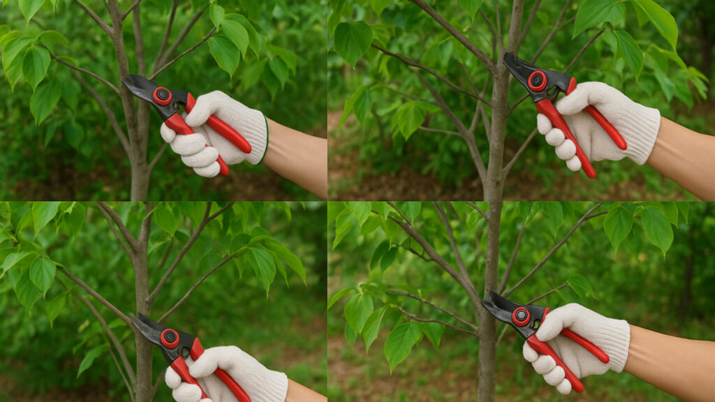 枝を途中で切ると、そこから複数の芽が出て樹形が乱れることがあります。枝分かれ部分の少し上で切ると自然にまとまります。