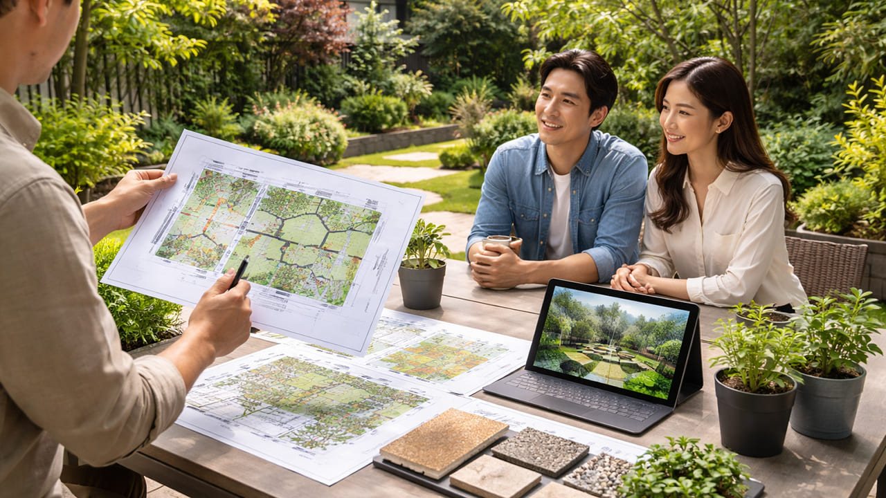 ヒアリングの重要性: 「子供が遊べるスペースが欲しい」「目隠しフェンスで視線を遮りたい」「剪定の手間を減らしたい」など、まずはわがままをすべてお聞かせください。