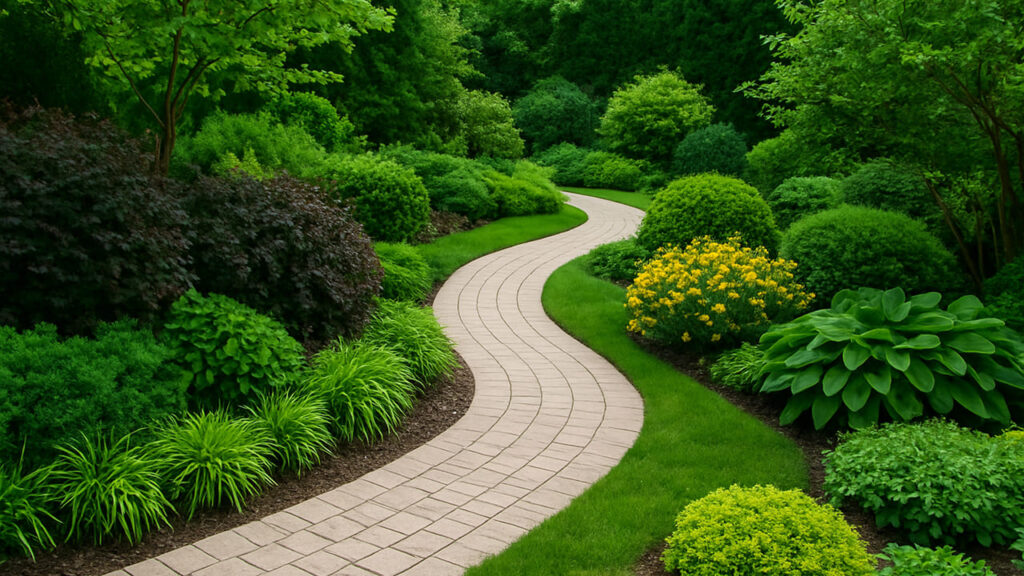曲線のアプローチや複雑な植栽配置は手間がかかり、高額になります。