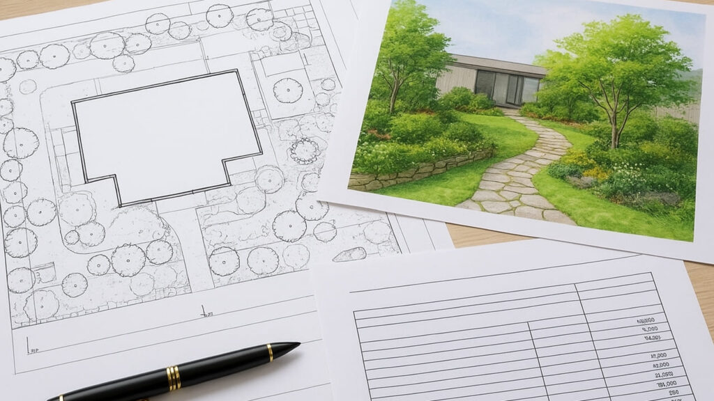 調査結果と希望をもとに、プロが造園プランを作成します。図面やイメージパース、見積書を提出します。