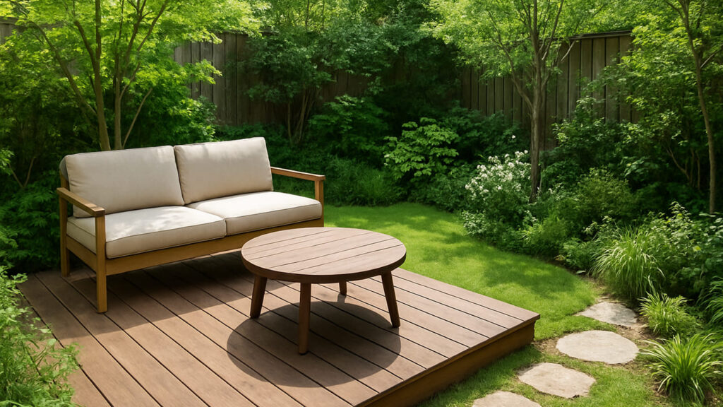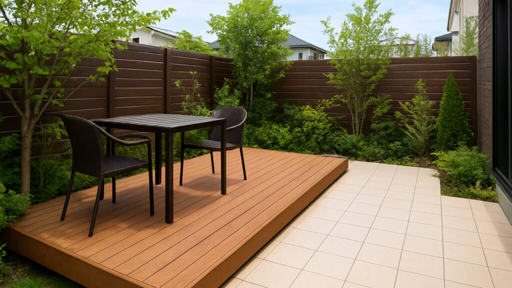 ウッドデッキやタイルテラスを造園に取り入れるスタイル。