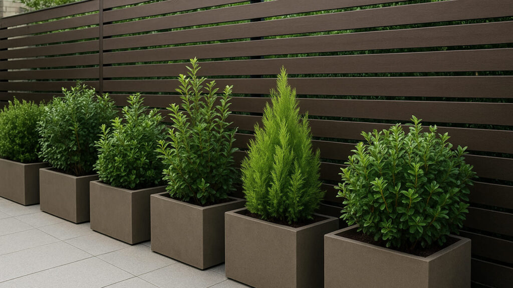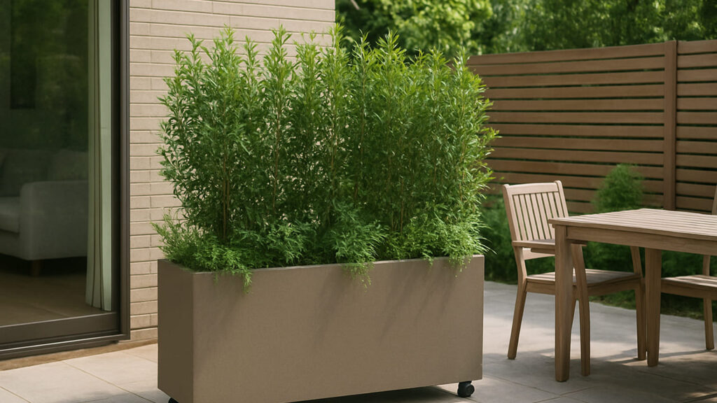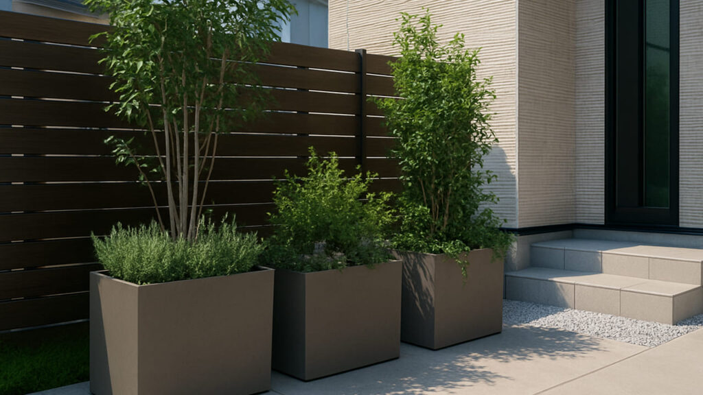 高いフェンスや壁で囲うよりも、植栽プランターを使った目隠しは柔らかく自然な印象を与えます。常緑樹のトネリコやコニファー、竹や笹などを植えると、年間を通して目隠し効果を維持できます。
