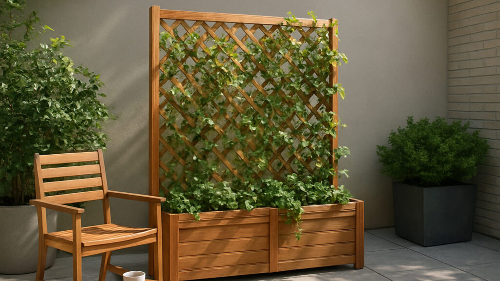 木製やアルミ製のプランターを選び、格子状の背面をつけるとツル性植物を絡ませることもできます。自然のカーテンのように風を通しながら目隠しができ、外構が一気におしゃれに見えます。