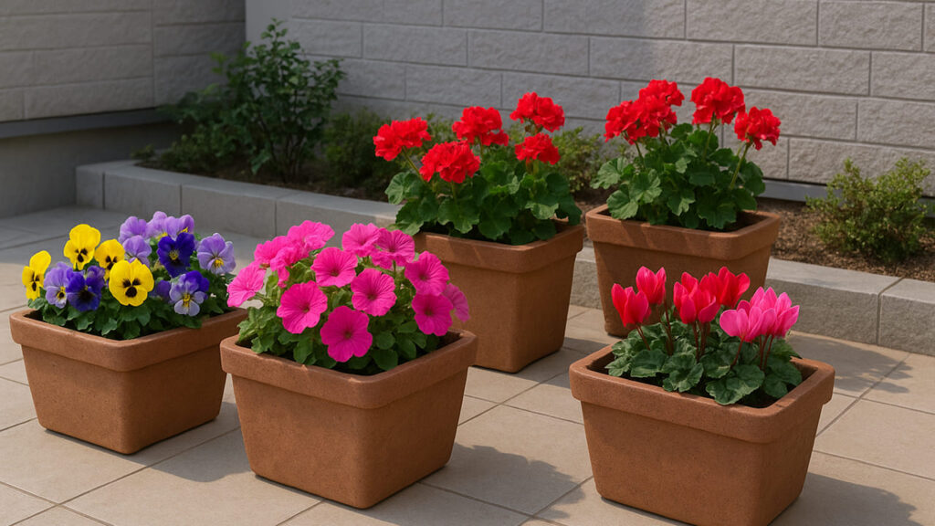 春はビオラやパンジー、夏はペチュニアやゼラニウム、秋冬にはシクラメンなど、季節ごとに花を植え替えることで、外構が常に華やかに。プランター植栽なら手入れもしやすく、気分に合わせてレイアウトを変えられます。