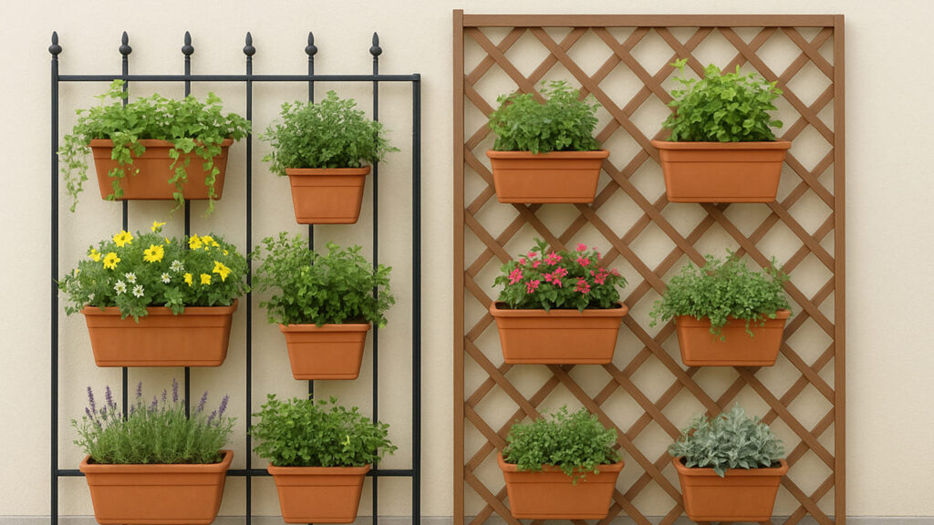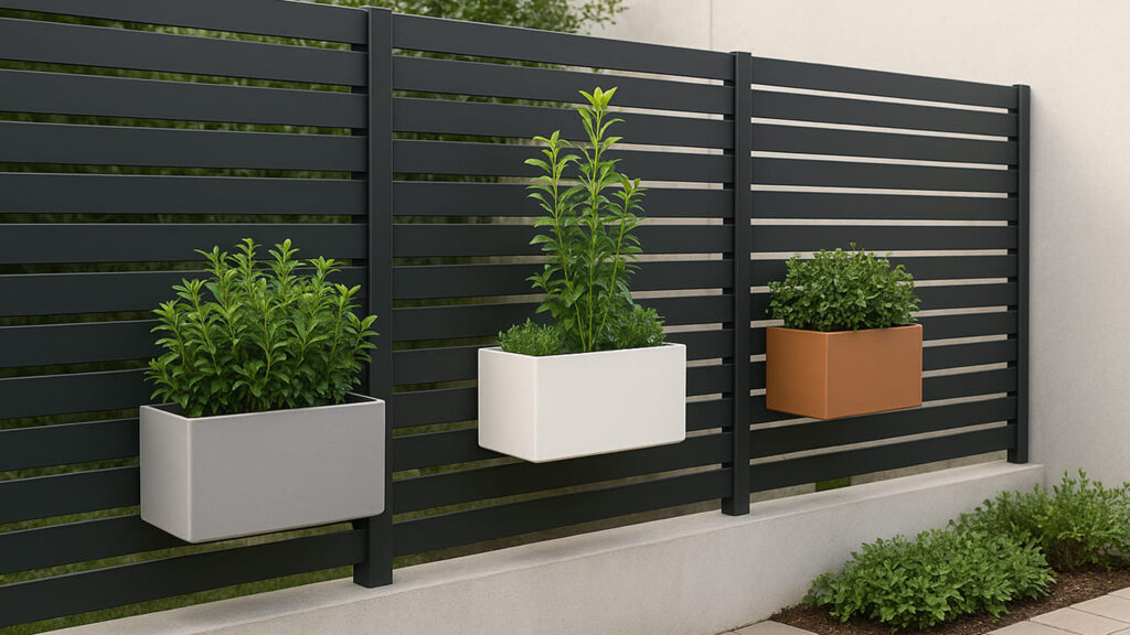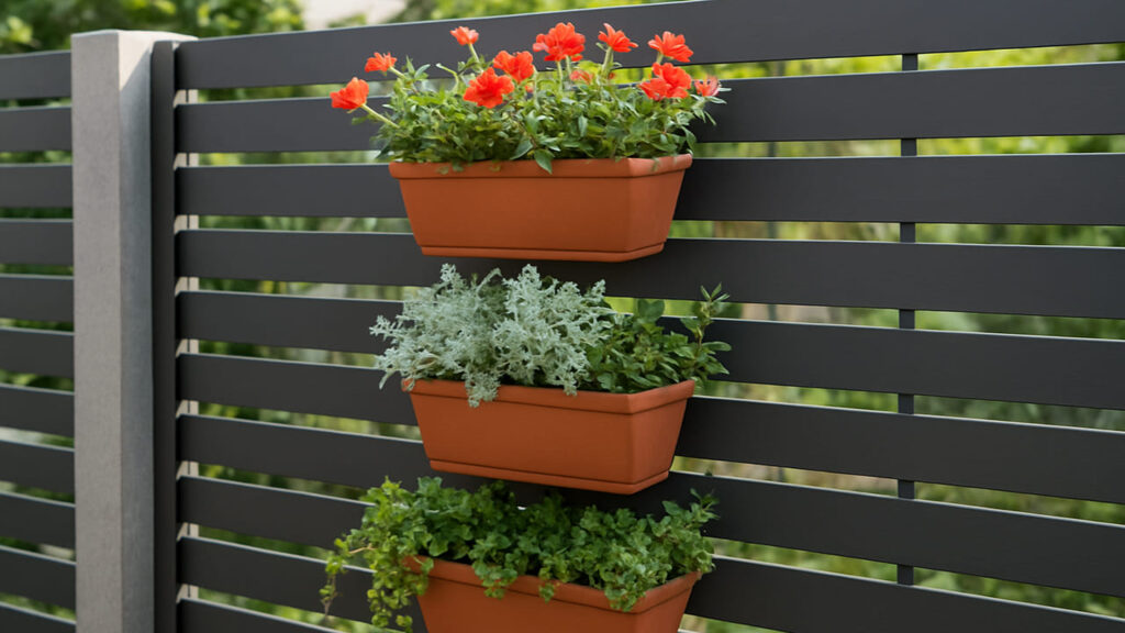 アイアンフェンスや格子フェンスにプランターを掛けると、まるで「緑の壁」のように外構を彩れます。狭い敷地でも、垂直方向に植物を配置することで空間を有効活用できます。