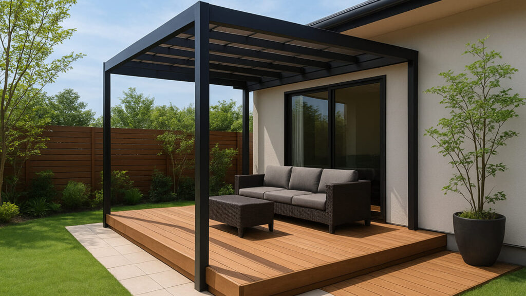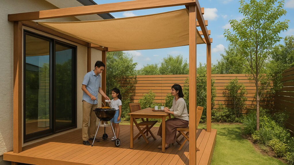 プライベート空間の中心となるのが、タイルデッキやウッドデッキです。屋内からの動線をそのまま外に延ばすことで、自然に庭を活用できるようになります。さらに、屋根付きのパーゴラやテラス屋根を組み合わせれば、日差しや雨を気にせず快適に過ごせます。