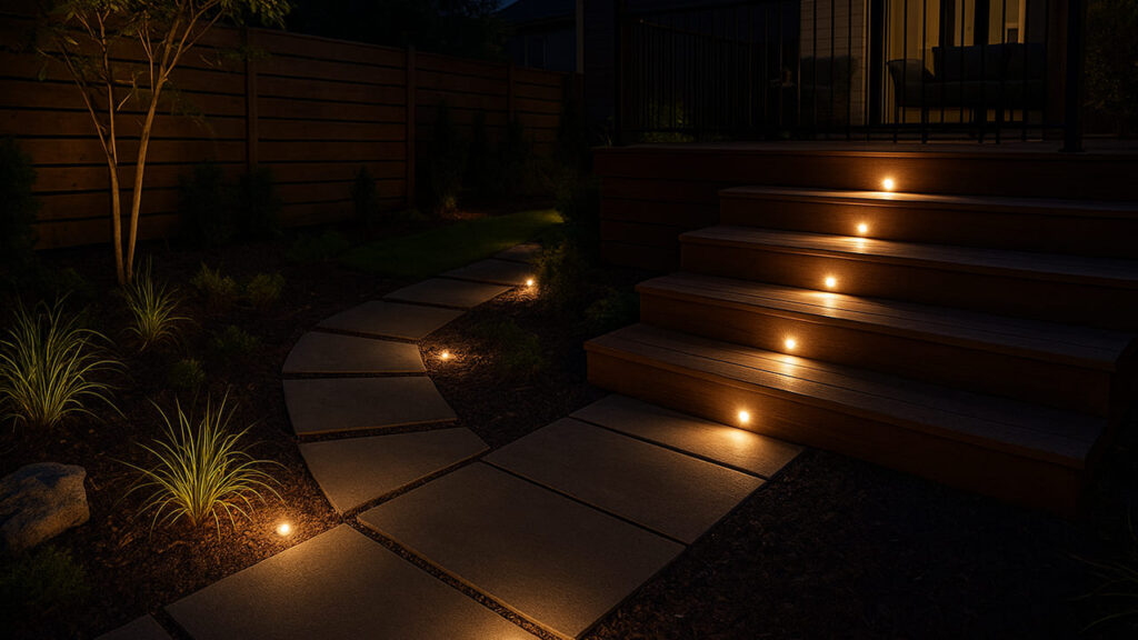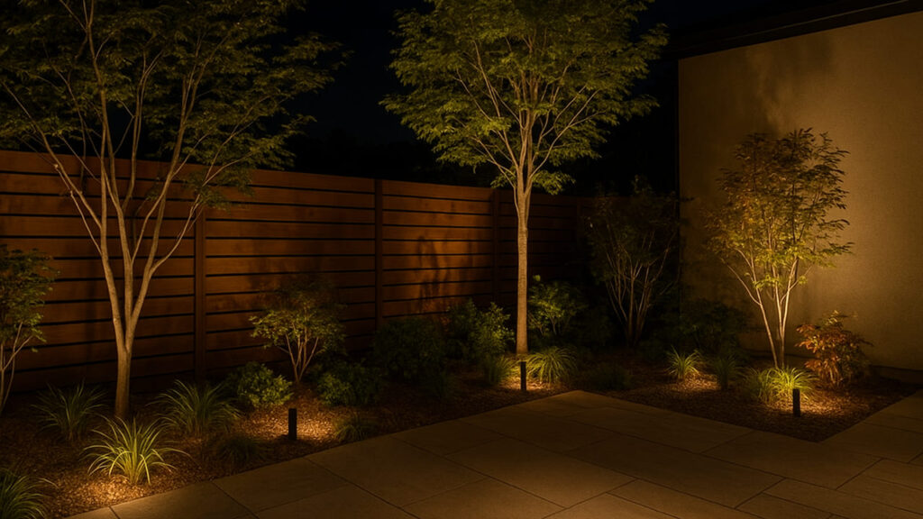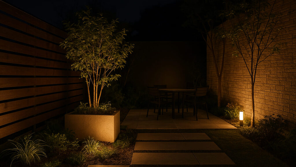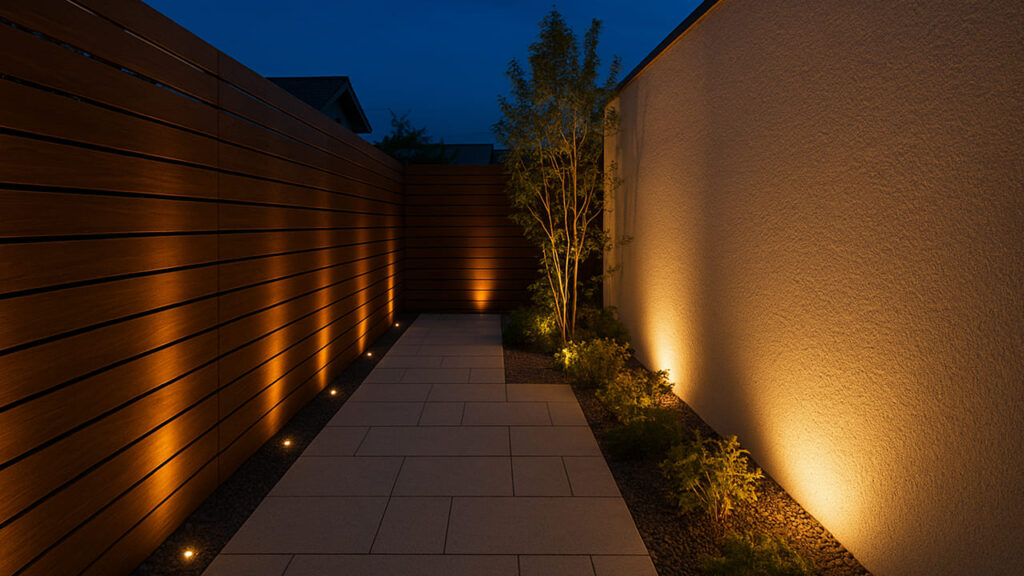 プライベート空間は「昼だけ」ではもったいないです。外構照明を取り入れることで、夜も雰囲気のある空間になります。照明があることで安全性も高まり、防犯面でも効果的です。おすすめの照明演出は以下の通りです。