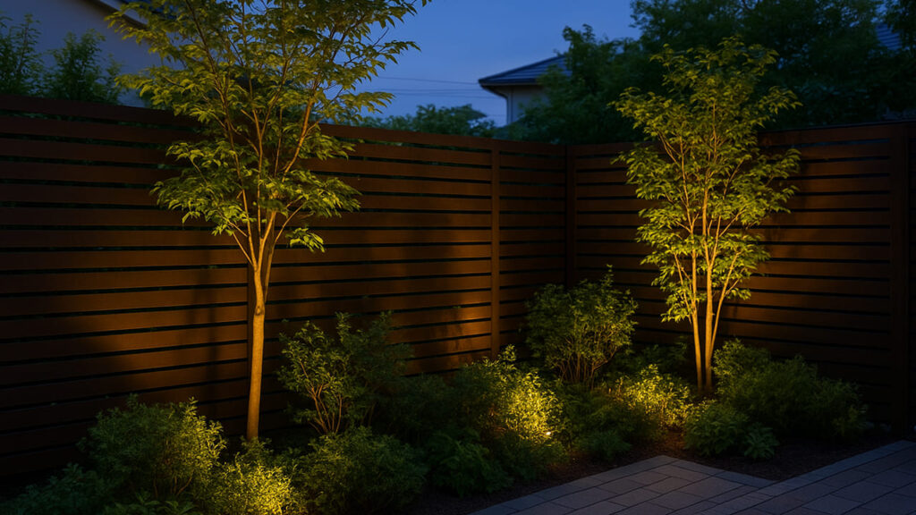 完全に閉じてしまうと圧迫感がありますが、ルーバーフェンス+植栽の組み合わせなら、風と光を取り入れながら視線を遮れます。昼は緑が映え、夜はライトアップで雰囲気も抜群です。