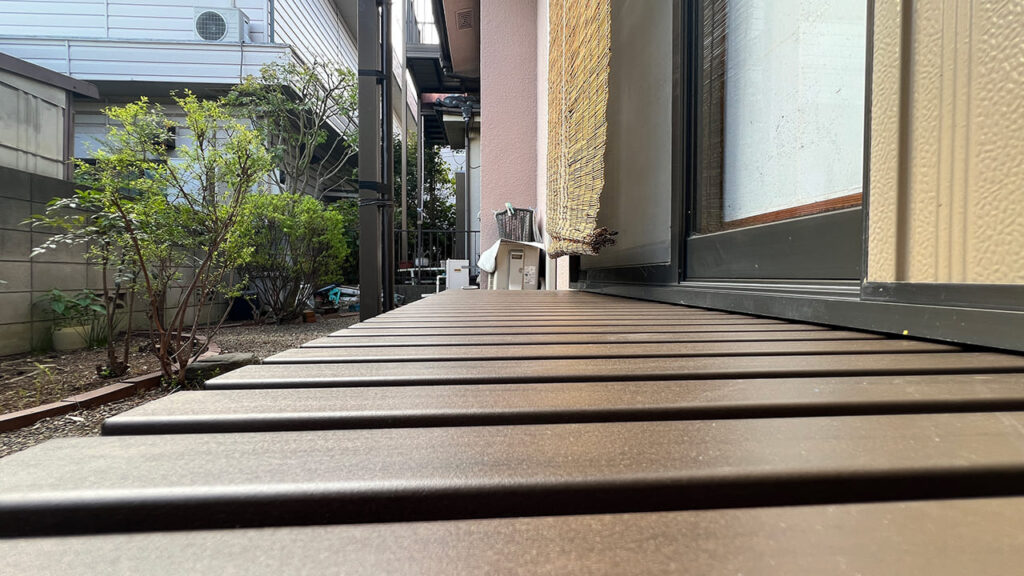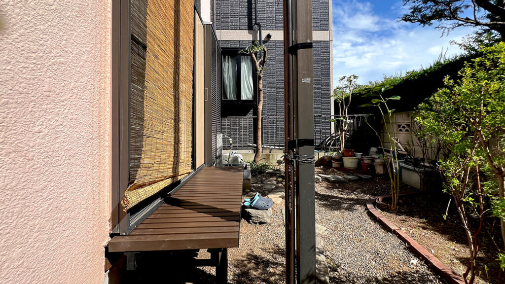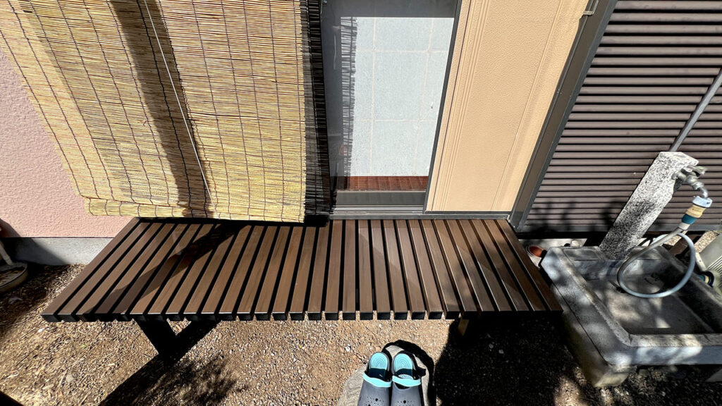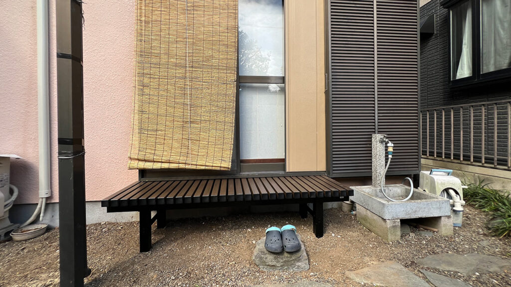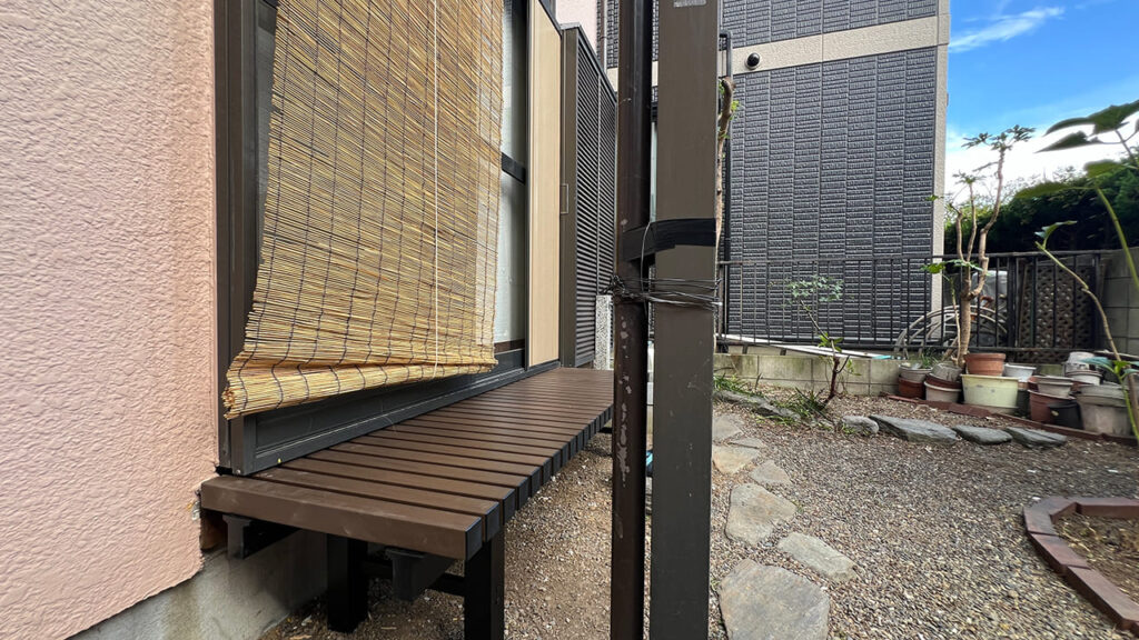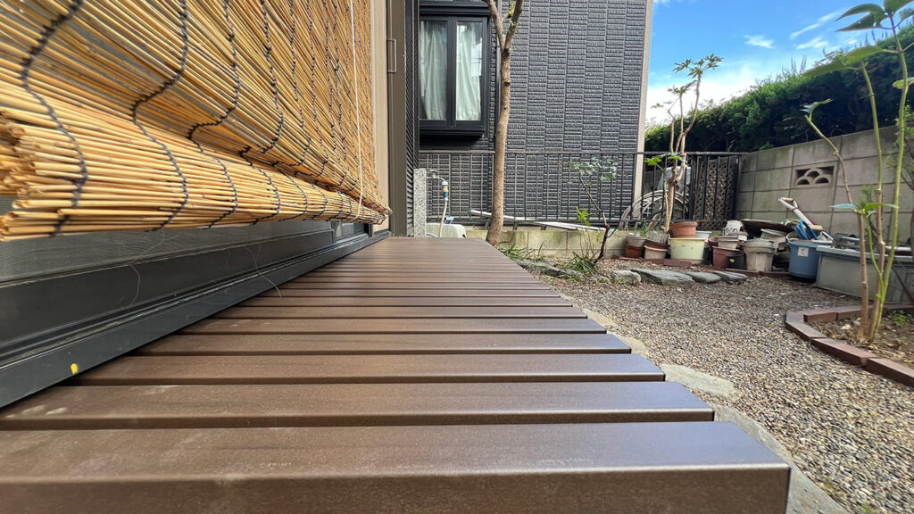 埼玉県越谷市の外構工事です。お庭の濡れ縁をリフォーム致しました。既存のものは天然木の濡れ縁だったのですが、腐ってしまい、今回は人工木の濡れ縁に致しました。人工木なのでメンテナンスがほとんどありません。施主様はご高齢なのでなるべくメンテナンスが少ない物に致しました。以前のは座る事も困難だったため、今回のリフォームでゆっくりとくつろげると思います。