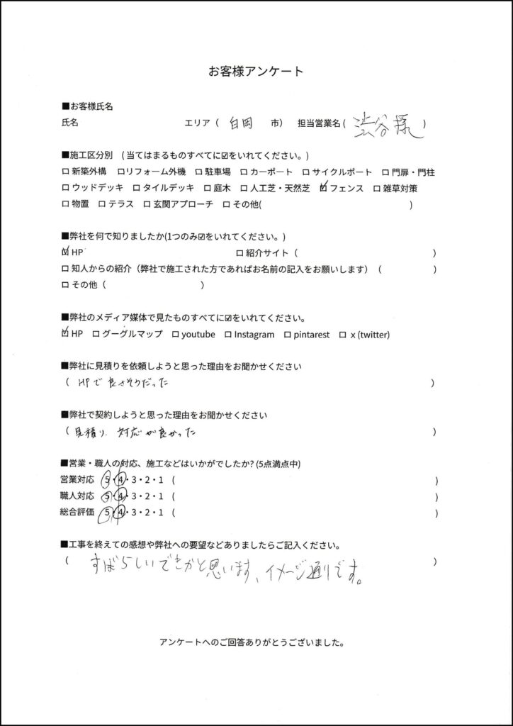 この度は弊社で目隠しフェンスを施工させて頂き、誠に有難うございます。イメージ通りで本当にに良かったです。また今度、何かありましたらお声掛け頂ければと思います。この度はアンケート有難うございました。