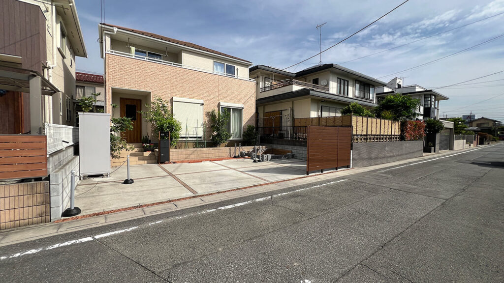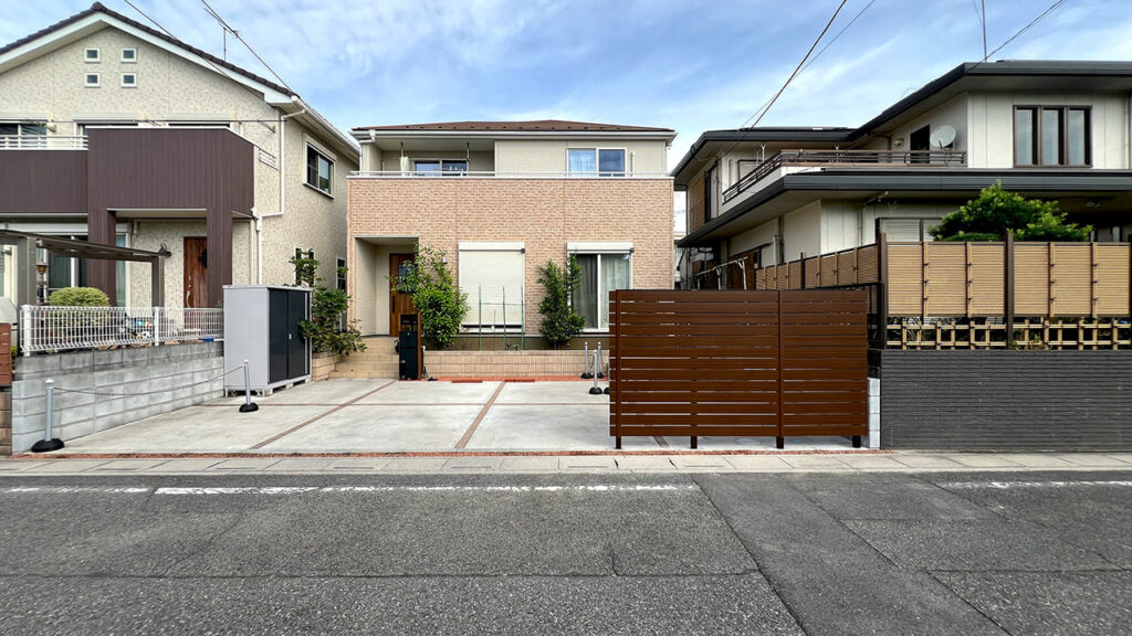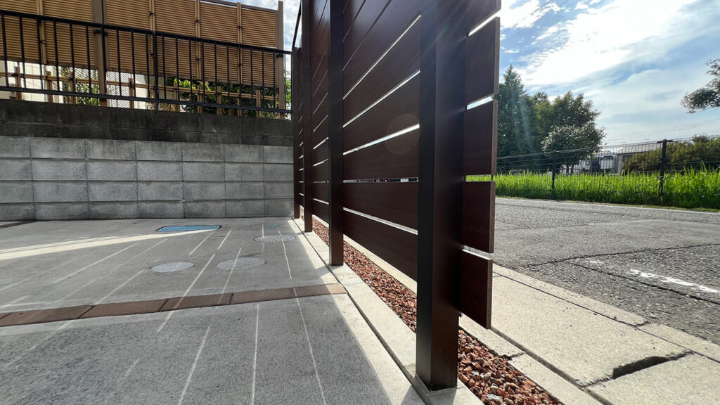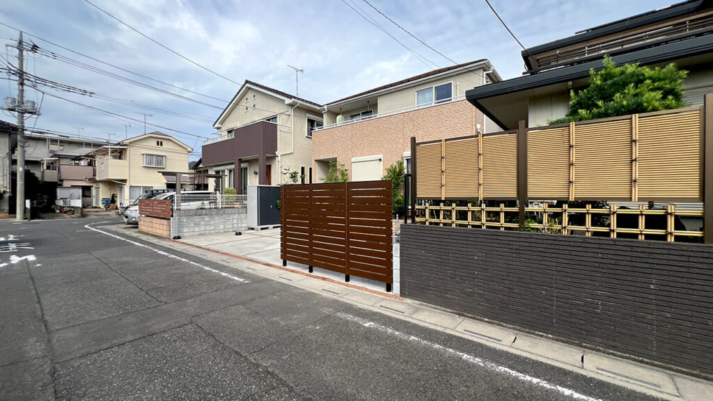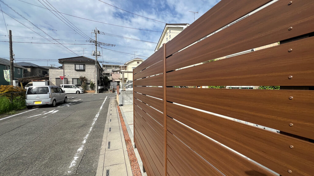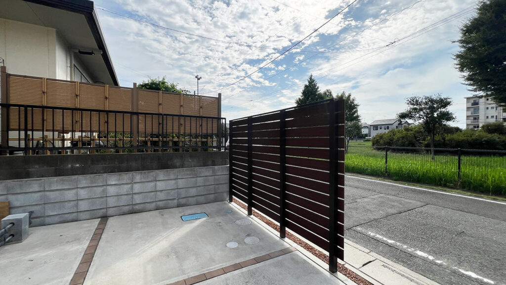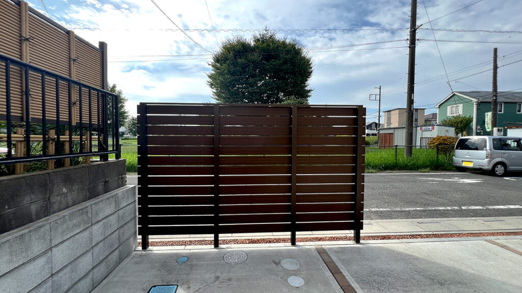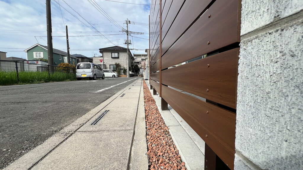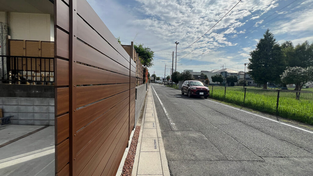 埼玉県白岡市の外構工事です。向かいの公園からの視界が気になるということで道路境界に目隠しフェンスを設置致しました。お自宅がナチュラルな感じなので木目調の目隠しフェンスになりました。F&FのマイティウッドデコⅡを使用しています。しっかりと目隠し出来るように隙間を狭くして高さを1.8mにしています。柱は地先ブロック内に納まるように工夫されています。