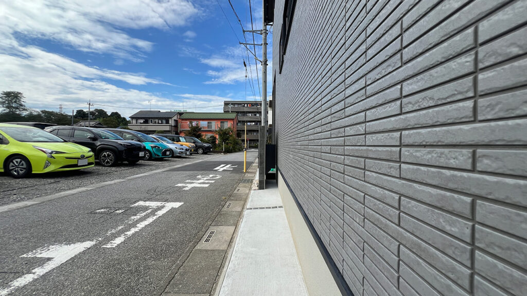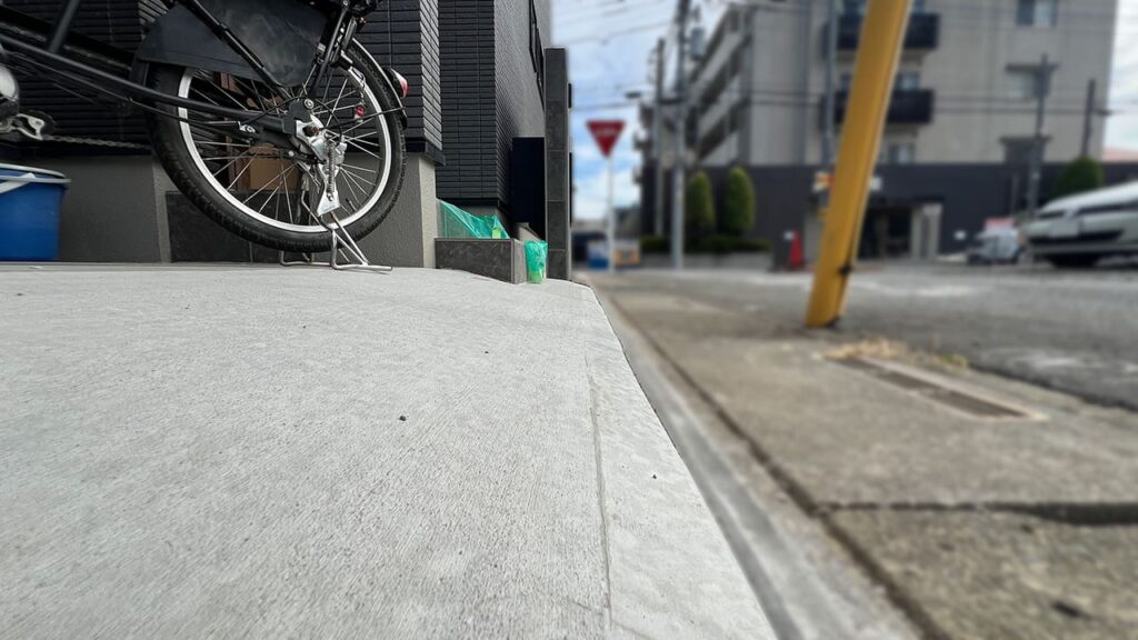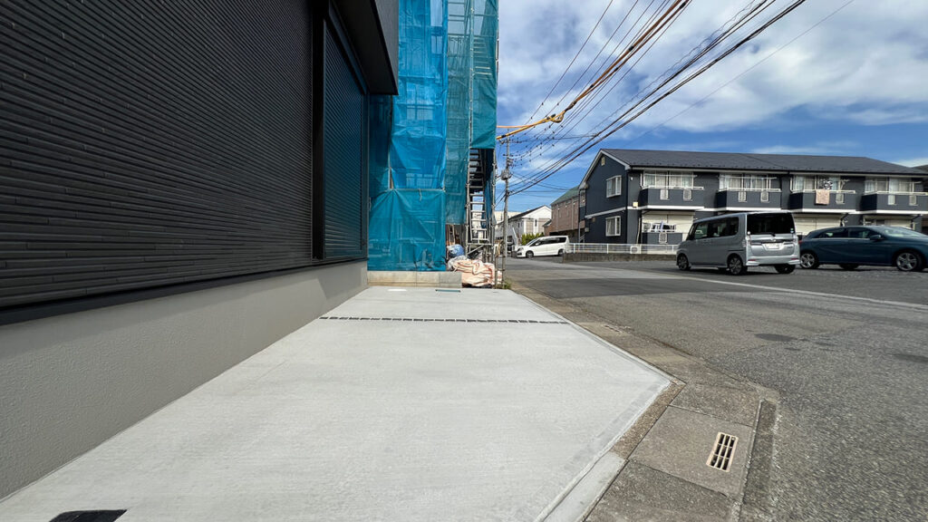 埼玉県川口市の外構工事です。駐車場はコンクリートでピンコロのスリットになります。コンクリートと伸縮目地だと、味気ないのでスリットを工夫する事でおしゃれにする事が出来ます。駐車場なので滑らないように刷毛引き仕上げに致しました。玄関前もコンクリート仕上げしています。こちらは高低差が若干ありますが距離が短いので角度をつけての施工になりました。