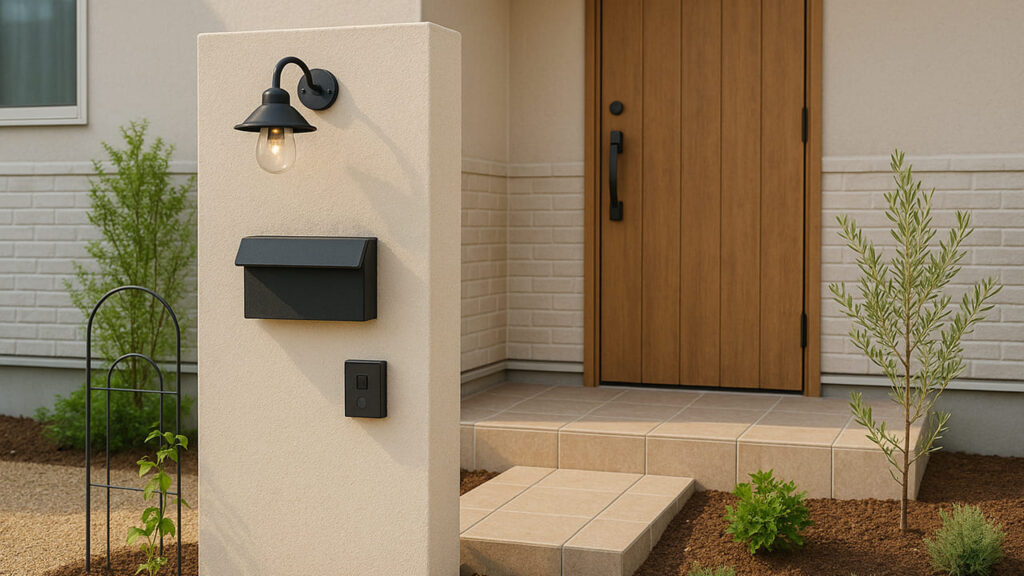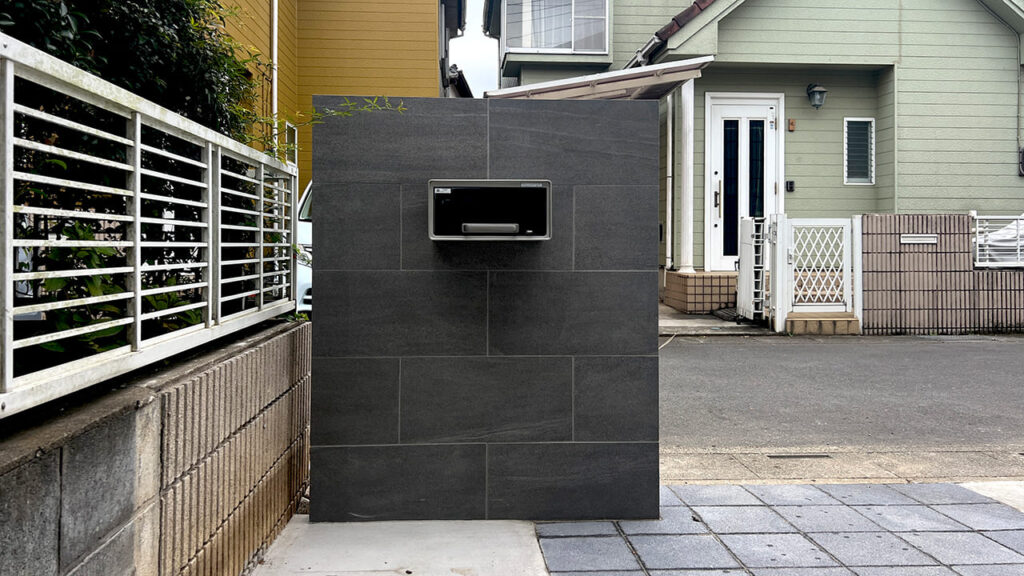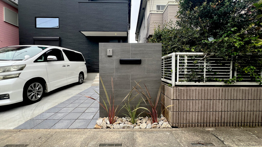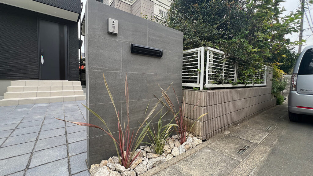 商品 | ポスト:LIXILエクスポスト ブラック タイル:タカショーセラレバンテ(グレー)600✕300角 割栗石: 植栽:ニューサイラン |