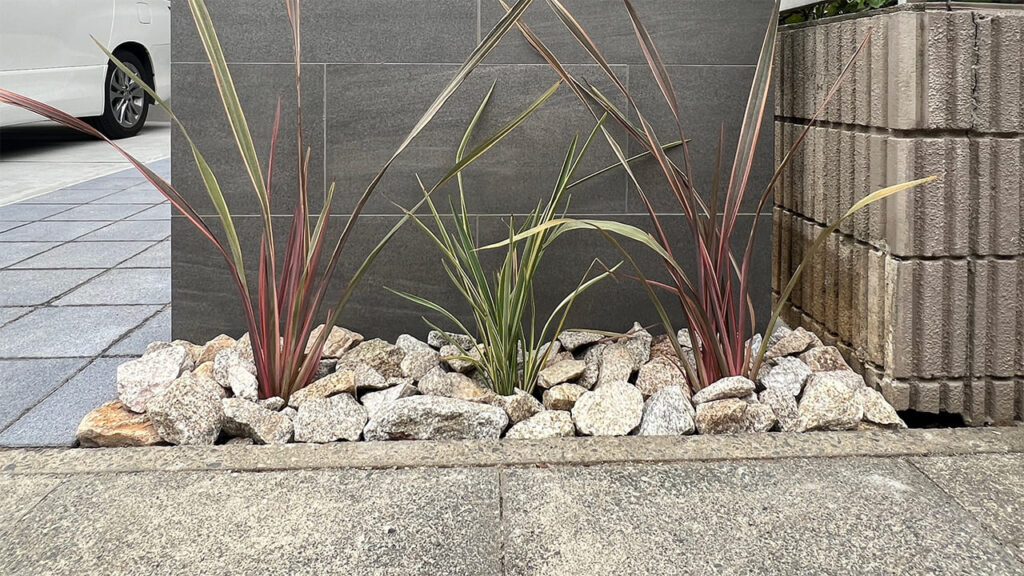 ニューサイランは、ニュージーランド原産の多年草(常緑植物)で、外構や庭の植栽で人気の高い植物です。シャープでスタイリッシュな葉姿が特徴の植物です。細長く剣のように立ち上がる葉は存在感があり、モダン外構やドライガーデン、リゾート風ガーデンなどにとてもよく合います。また葉色が豊富で、品種によって印象が大きく変わります。銅葉・赤葉が建物の外観を引き締めます。お手入れが楽で常緑なので1年中、葉がキレイです。