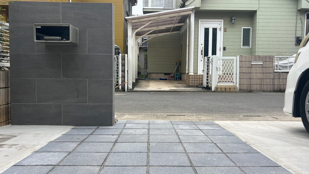埼玉県春日部市の外構工事です。玄関アプローチはインターロッキングは透水性のある物を使用。水はけを重視致しました。この他に、水たまりがおきづらく、滑りにくいメリットもあります。カラーは建物がモダンなのでグレー系に致しました。サイズは300✕300の正方形です。