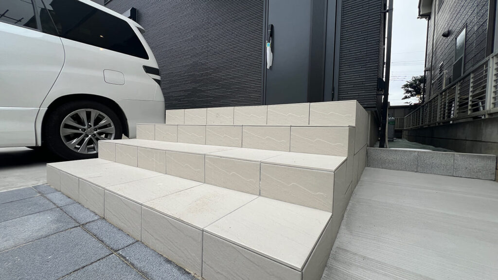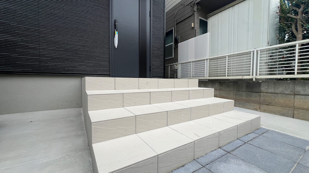 玄関ポーチは高低差があるので新しく3段追加いたしました。既存のタイルと同じ物を使用しています。